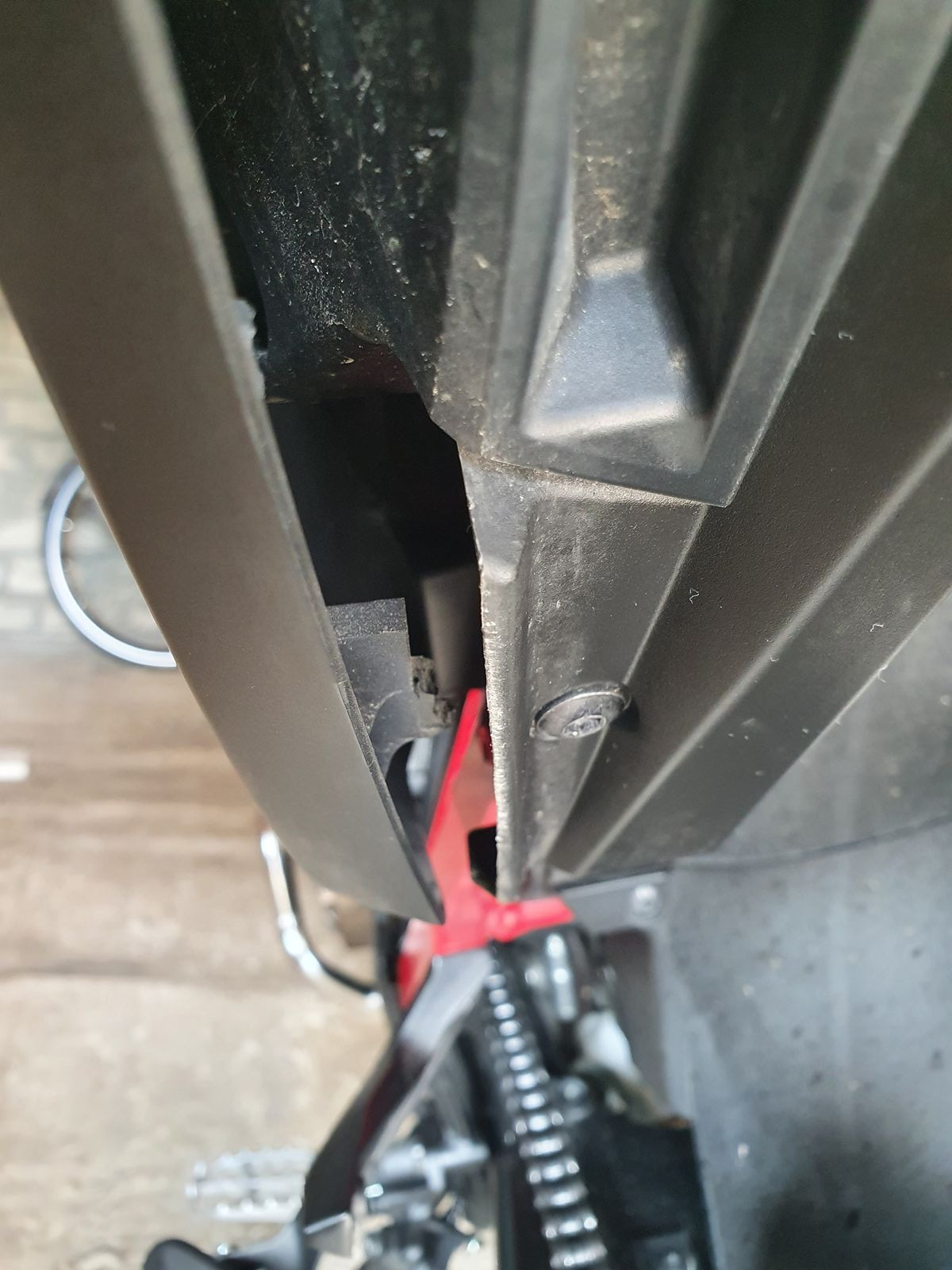 heute beim Bike waschen ist mir leider aufgefallen, das sich die Halterung der Verkleidung links unter dem Fahrersitz verabschiedet hat.