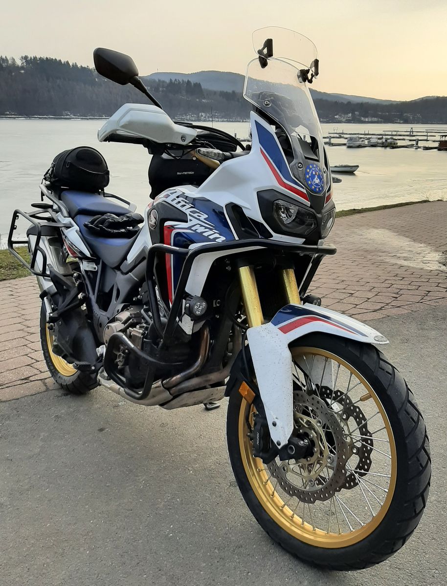 Africa Twin 1100 DCT - 2021 - Tricolor - 2,5 cm tiefergelegt - niedrige Sitzbank - Zusatzscheinwerfer - Griffheizung - H & B Sturzbügel - hohe Scheibe, Hauptständer, Kettenoiler - Garmin Navi-abschließbar, Koffer