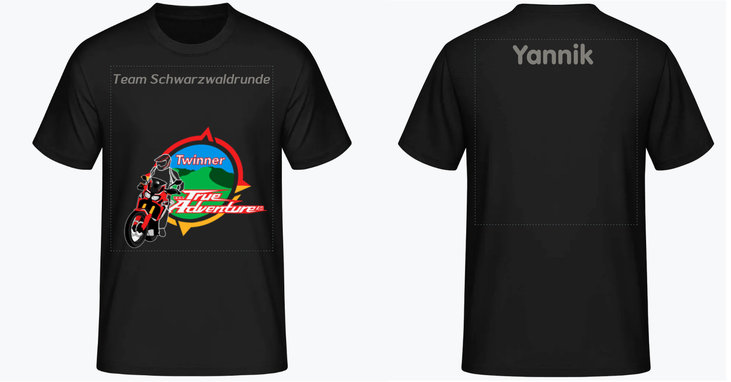 Noch ein Gedanke war, dass Jens das Design in den verschiedenen Modellfarben zur Verfügung stellen würde, allerdings ohne Nickname im Logo. Diesen würde ich dann so auf dem Shirt mit einfügen.