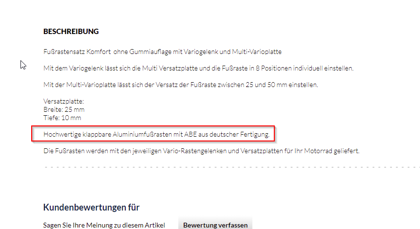 Fußrasten kosten knapp 200 Euro bei max 5cm Veränderung https://motacc.de/fussrasten/v…uni-incl.-variogelenk?c=6 Ich habe gerade mal abgefragt ob die ne ABE haben.