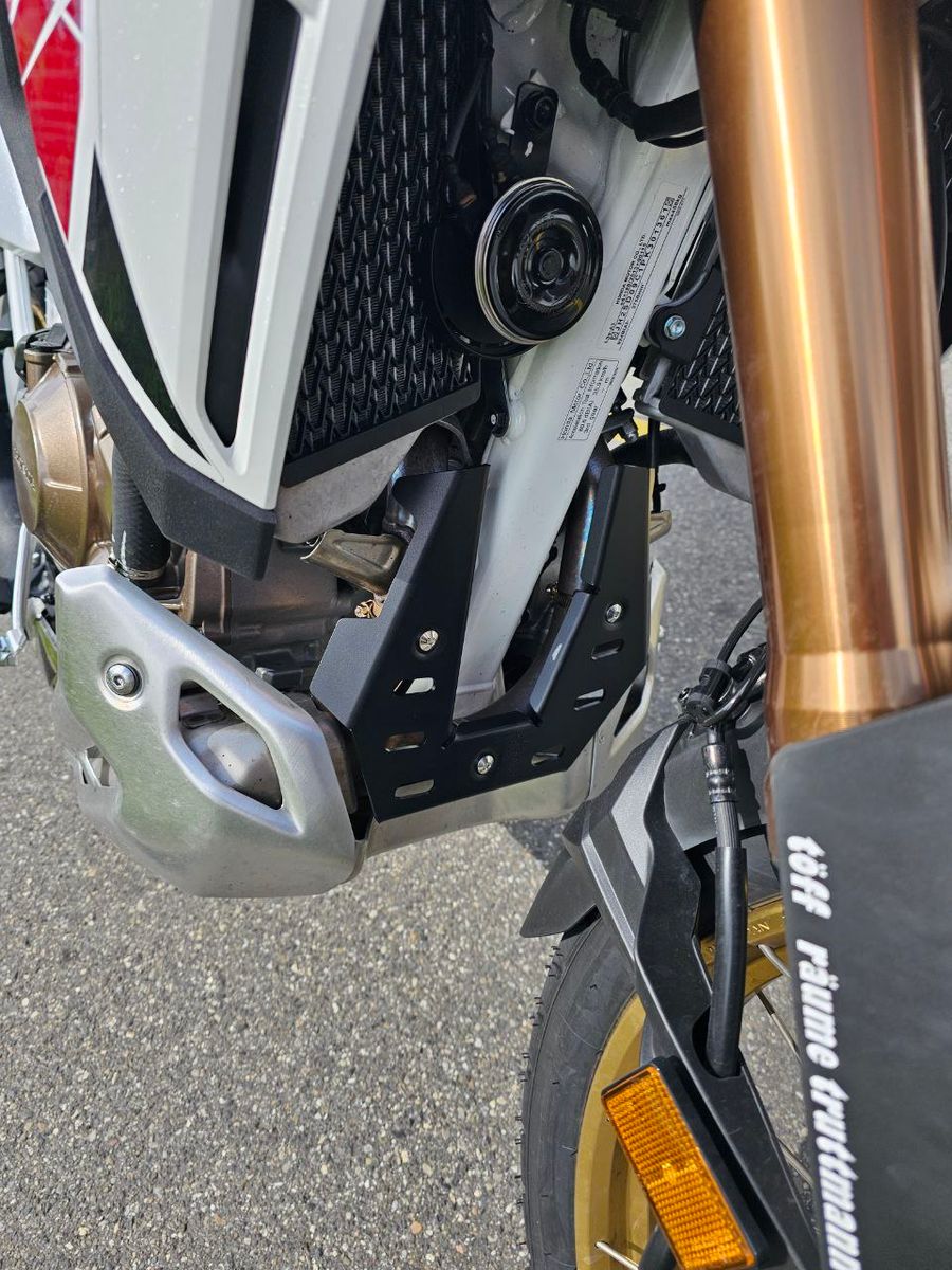 Der Standard Unterfahrschutz hat einen großen Ausschnitt in der Mitte, und da fliegen die Steine hoch vom Reifen, mit der kleinen Platte ist die Lücke gefüllt. Hat in meinem Fall bislang bestens funktioniert.