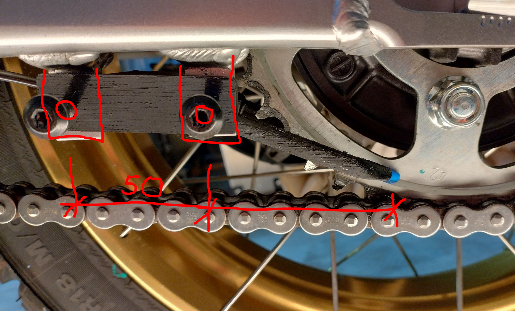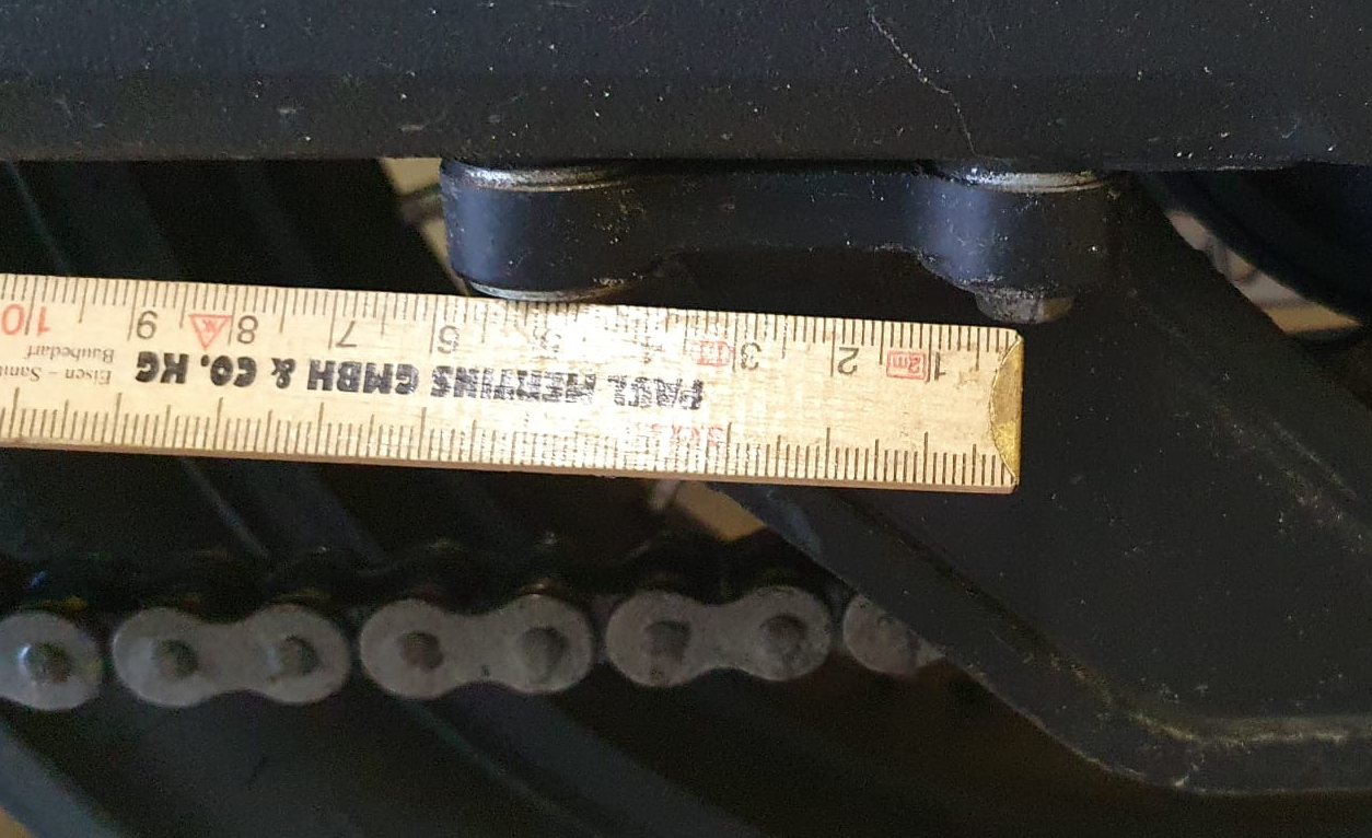 Das geht nur mit einer technischen Zeichnung , auf der alles stimmt. Nicht zu vergessen, dass die Schwinge nicht parallel zur Kette verläuft. Das habe ich auch berücksichtigen müssen. Das kann man nicht messen, sondern muss nach Motto vorgehen: Trial and Error.