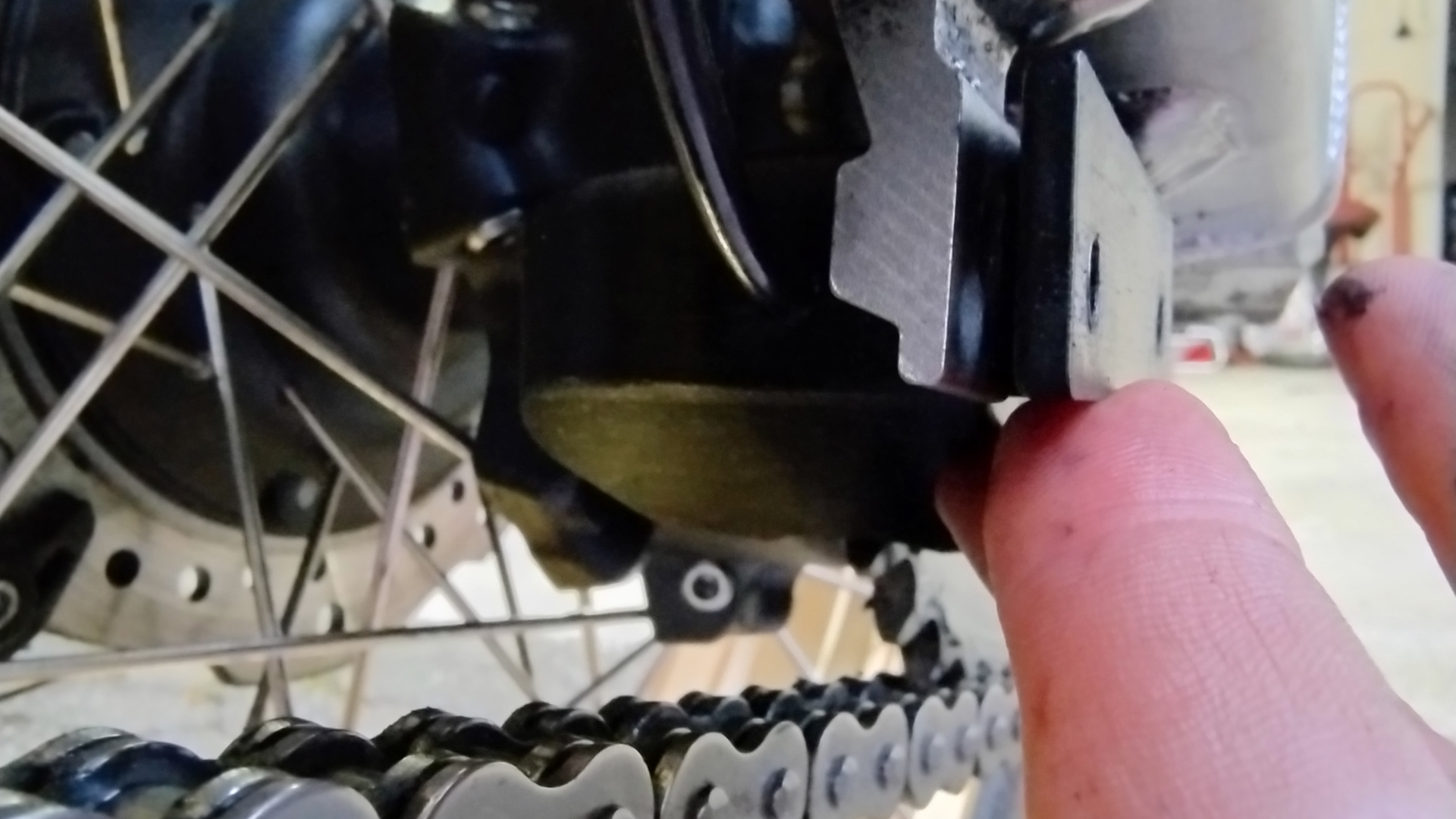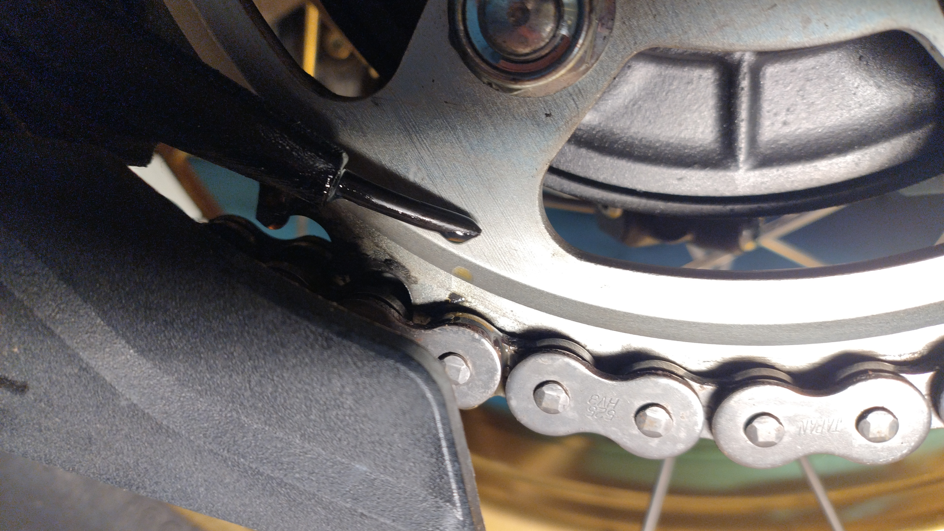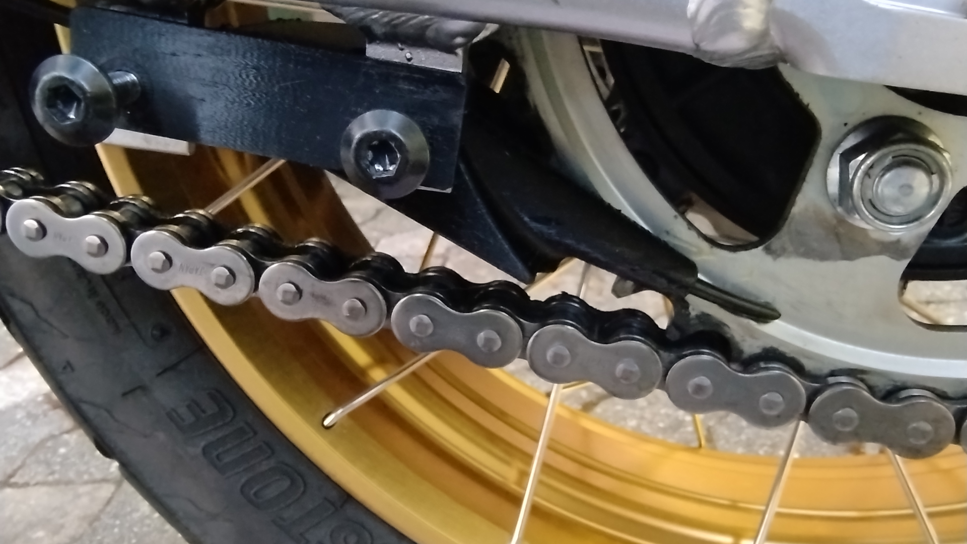 Wer wie ich den Öler in Asien gekauft hat, wird sich über die beiliegende zusätzliche Haltelasche freuen. Nachdem ich die hintere Schraube des unteren Kettenschutzes gegen eine Längere getauscht habe, konnte ich diesen mit Scheibe, Federring und Sicheringamutter befestigen. Erfreulicher Weise stützt die Lasche sich anschließend auf dem Kettenschutz ab.