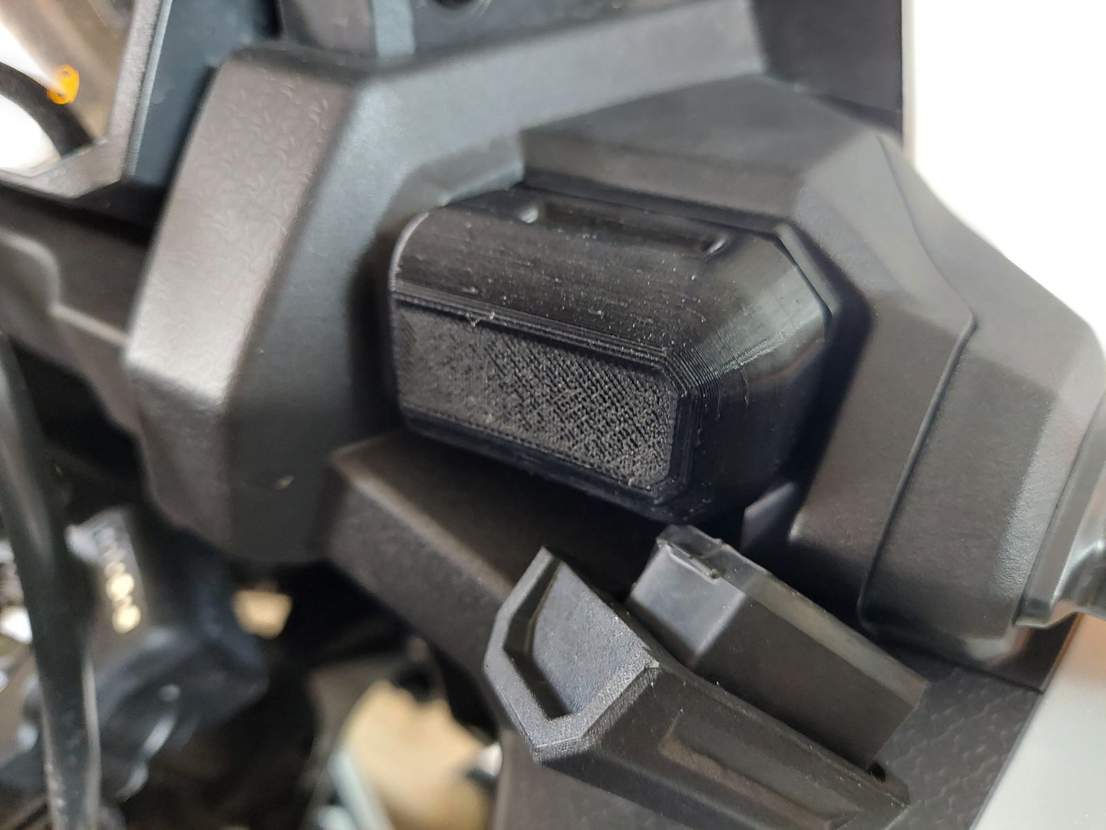 Jetzt müsste man nur noch herausfinden, was man alles abschrauben muss, um die Original-Gummikappe zerstörungsfrei von der Maschine zu kriegen. Ist das ein Lüftungsgitter in deiner 3D-gedruckten Kappe, oder sieht das nur so aus?