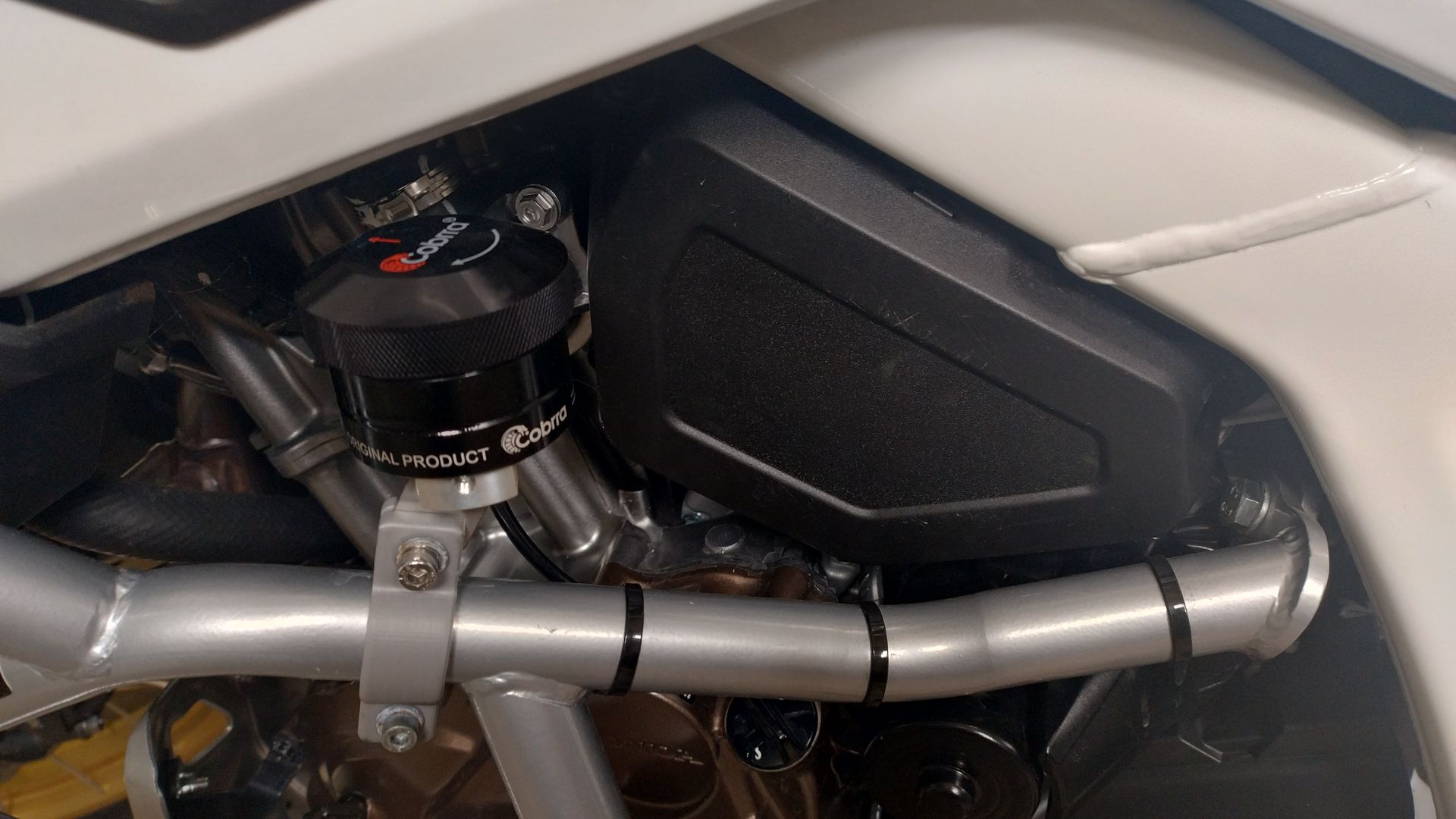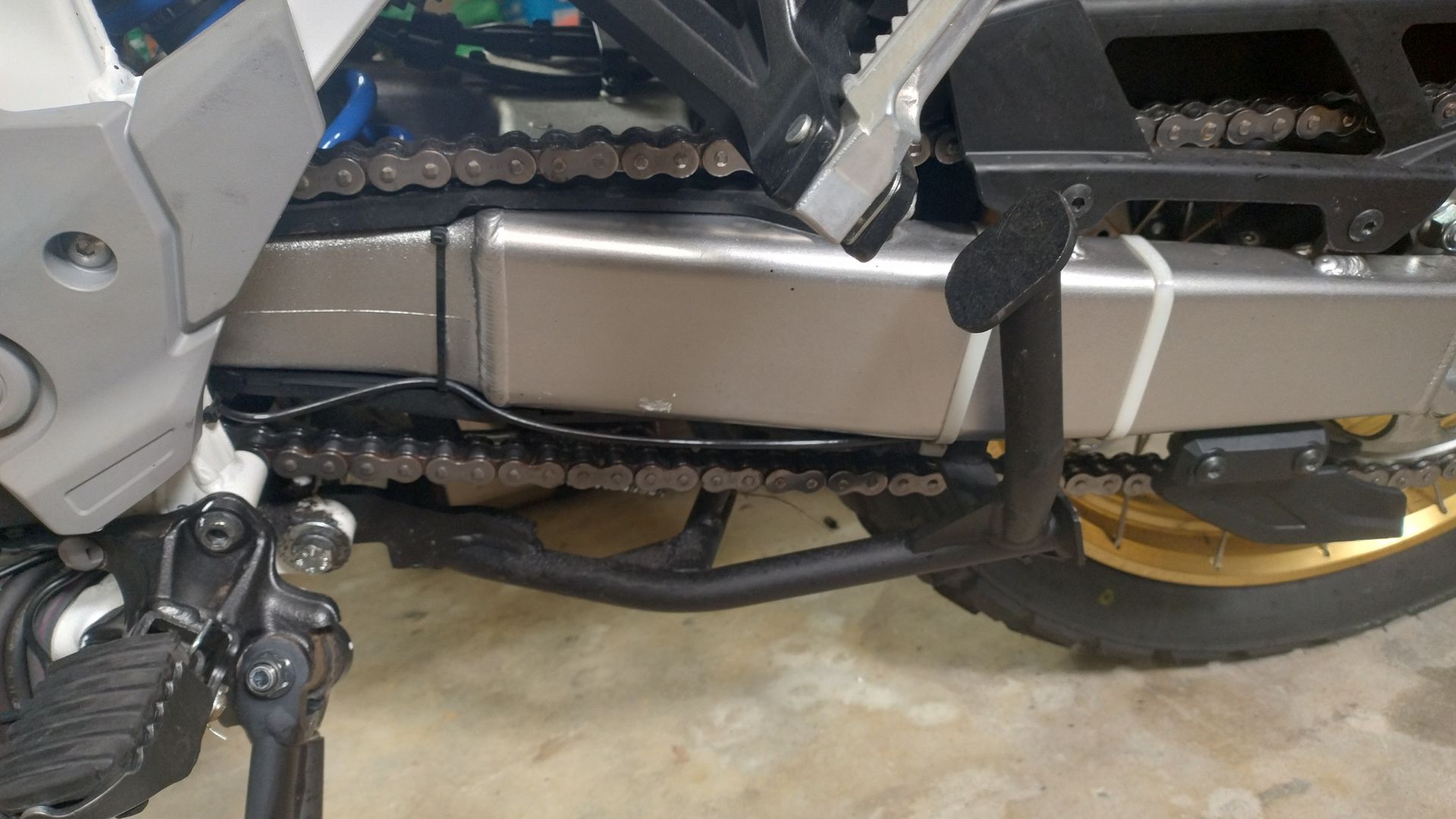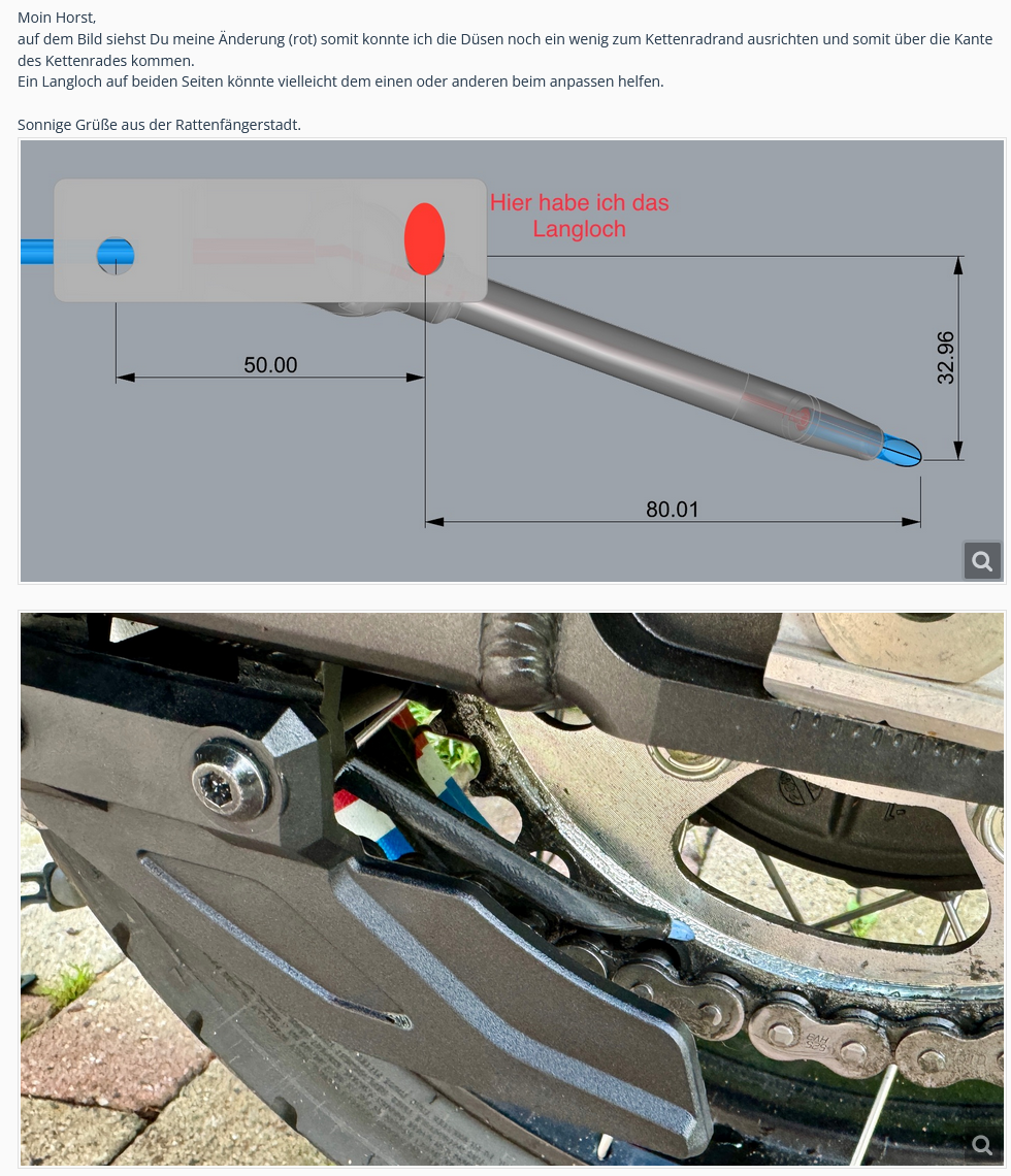 Alles anzeigenHallo AS_SD09_Biker, nachdem La Belle Sauvage entlich mal ein Bad genommen hat, habe ich mich an den Anbau "deiner" Doppeldüse gemacht. Auf den Fotos habe ich nur die Metallhülsen des Kettenschutzes als Platzhalter benutzt. Der Kettenschutz ist ja nicht dicker als seine Metallhülsen. Die Doppeldüse gefällt mir sehr. Bei der Montage ist mir folgendes aufgefallen.