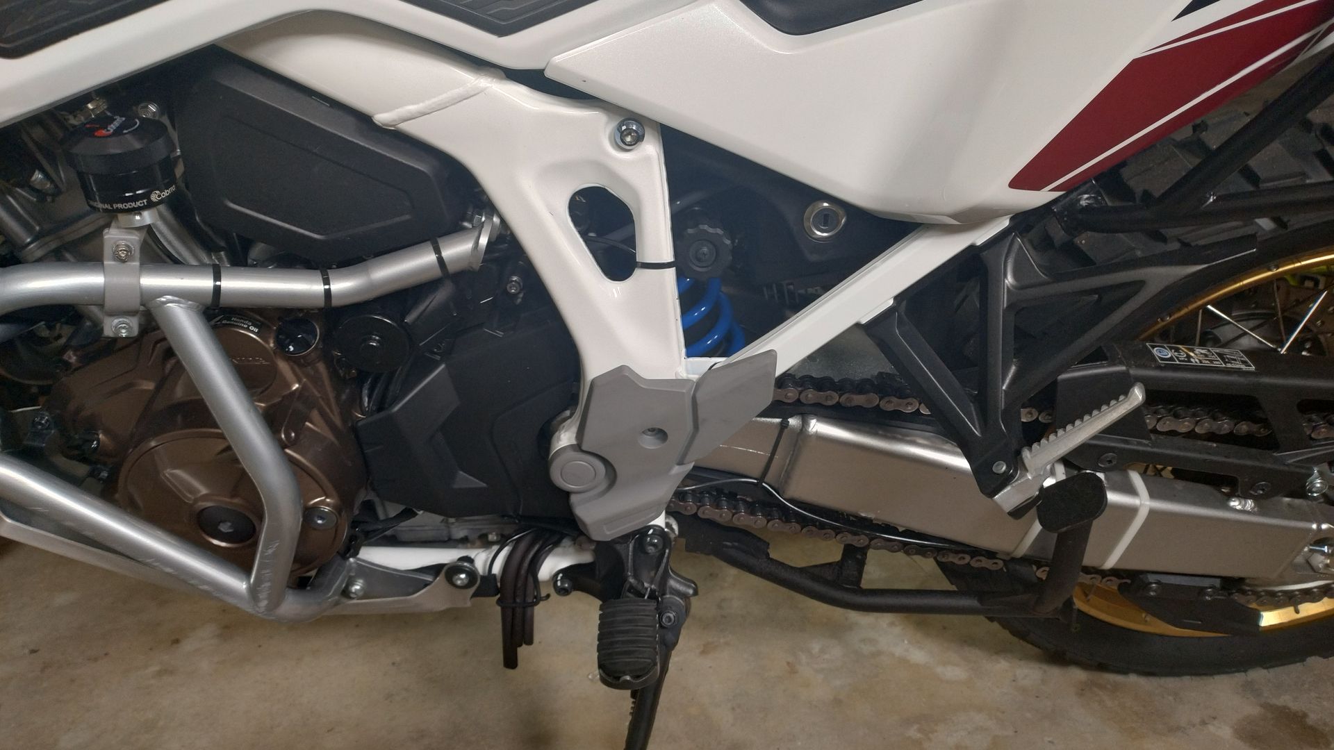 - Ich besorge mir etwas längere Schrauben für den Kettenschutz, denn die 3,7 mm (gemessen), die die Schrauben noch in die Kettenschutz-Halterung ragen, wenn die Doppeldüse möntiert wird, sind mir zu wenig. Vor allem, wenn hinten noch eine Unterlegscheibe dazu kommt.