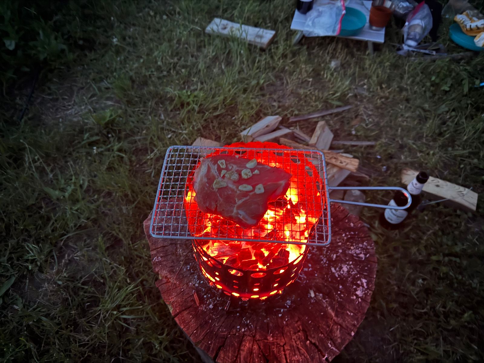 Mit dem Hackklotz, der eigentlich ein einfacher Picknicktisch des Camping Municipal war, passiert durch das Abstandskreuz mal rein gar nichts. Das X-Fire auf den Boden in das relativ hohe Gras zu stellen, hätte hingegen Spuren hinterlassen.