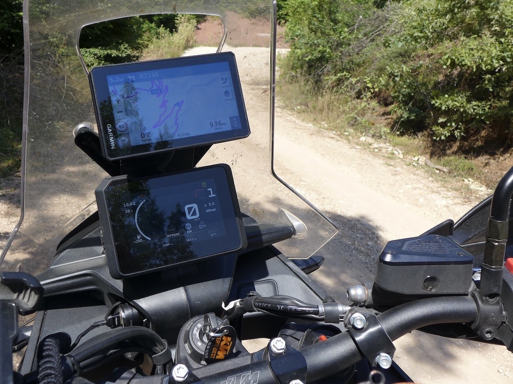 Jetzt kommt aber ein für mich wichtiger Punkt. Vorgeschichte: mit der ersten KTM hatte ich in der Gruppe an zweiter Position fahrend bei regennasser Fahrbahn einen für mich recht folgenschweren Unfall (nach knapp 50jähriger Fahrpraxis der erste). In einer engeren Rechtskurve auf der Landstrasse ist mir das Motorrad über beide Räder bei ca. 50 bis 60 km/h nach meinem Gefühl unmotiviert weggerutscht. In das "gegnerische" in dem Moment bereits stehende Auto hinein. Nach zwei aufwendigen Knie-OPs und mittlerweile neuem linken Knie inkl. aller Bänder bin ich heute froh, dass ich wieder einigermassen normal gehen kann, Radfahren kann und eben auch Motorrad fahren kann.