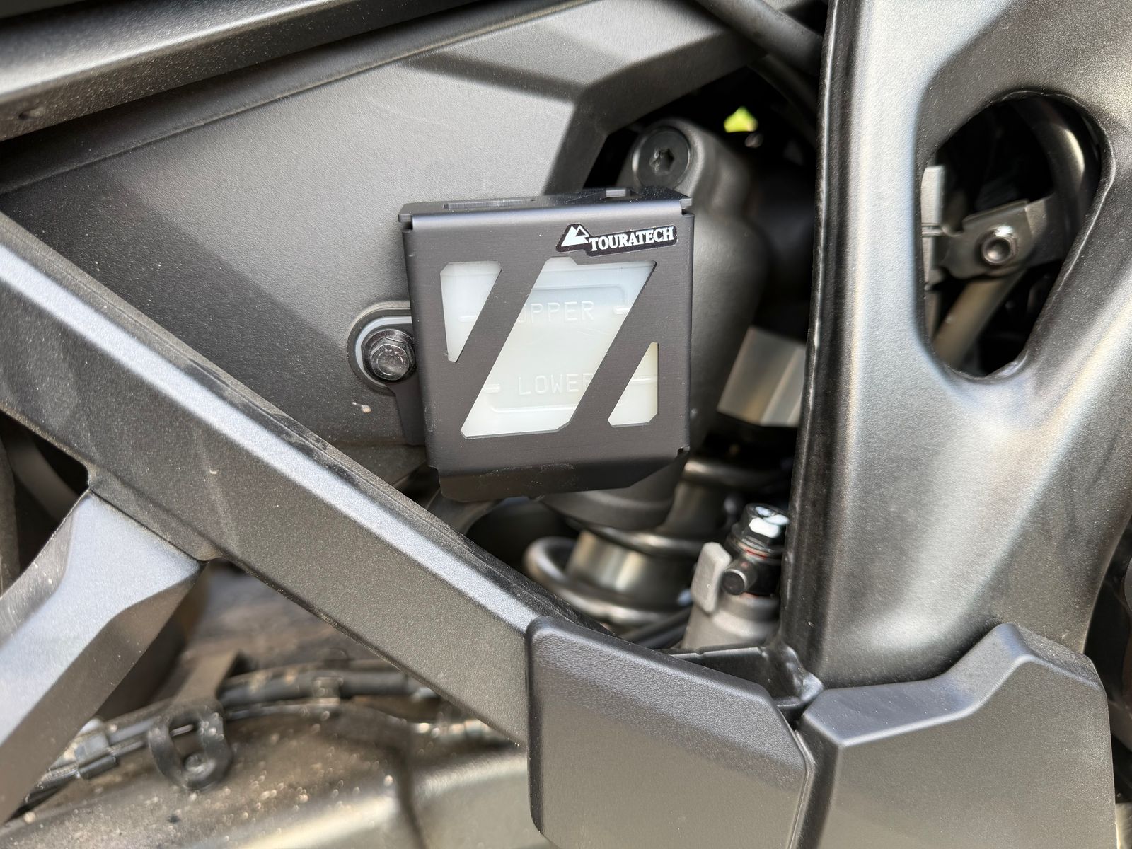 Am Fußbremshebel habe ich die Touratech-Verbreiterung montiert, gibt mir ein gutes Gefühl im Gelände. Der Seitenständer hat von dieser Firme einen "Entenfuß" bekommen für mehr Auflagefläche. Auch der Motorschutz, der Hauptständer und die darauf passende Schutzplatte kommen von Touratech. Ah, und das hübsche kleine Metallkistchen für den hinteren Bremsflüssigkeitsbehälter, das musste auch sein.