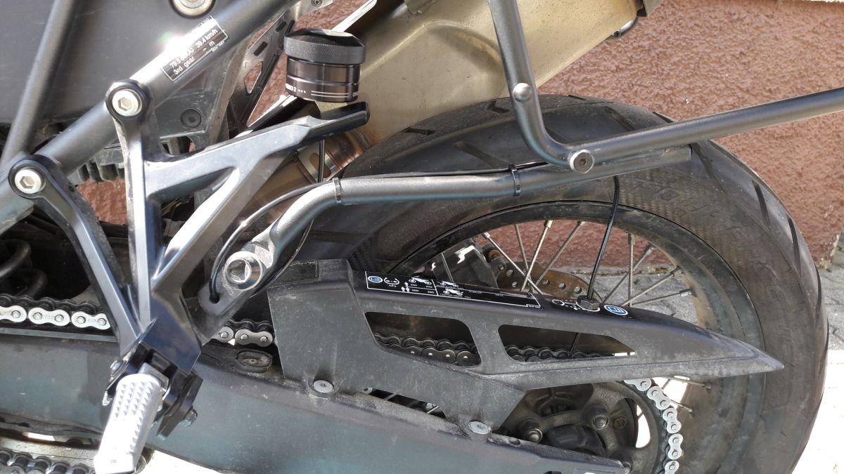 Der Schlauch steckt fest in der hohlgebohrten Schraube und schwingt absolut "weich" beim einfedern. Das benutzte Sägekettenöl hat bisher gut an der Kette gehaftet. Bis jetzt sehe noch keinen Grund die Leitung umzuverlegen. So und jetzt wird gefahren bei dem super Wetter.