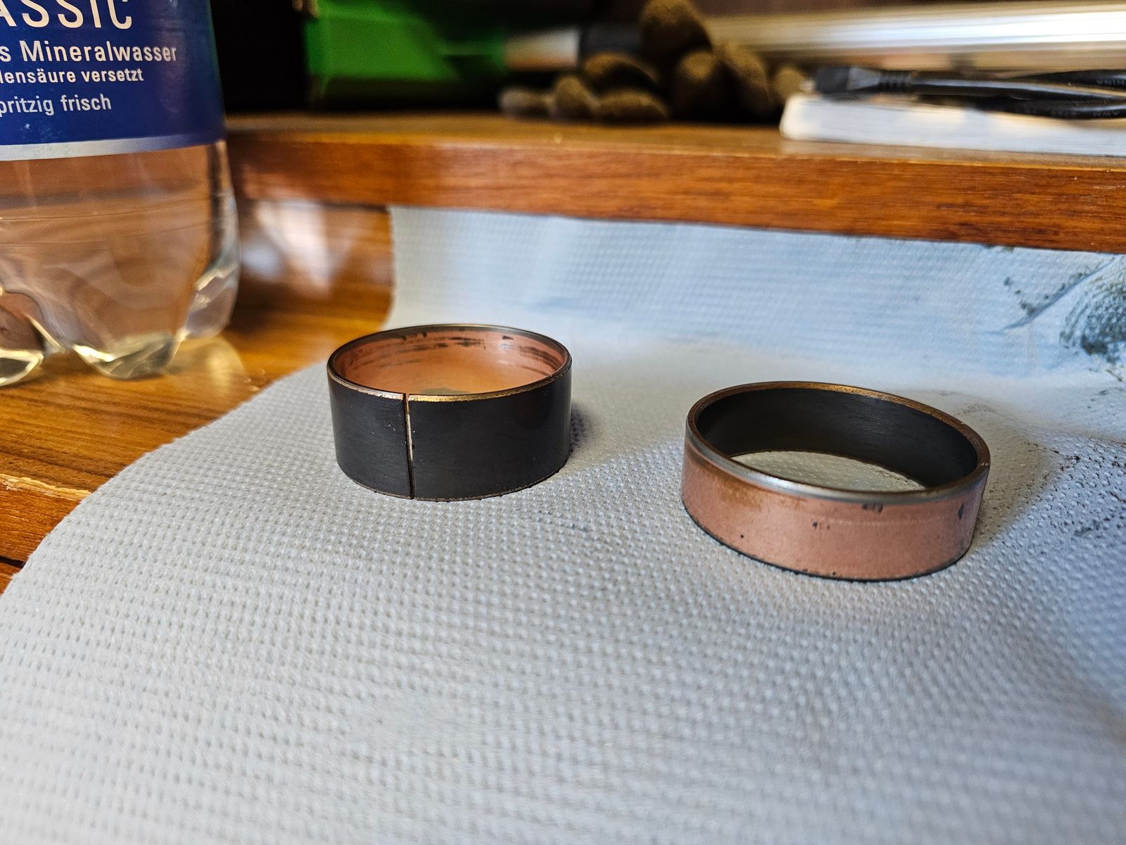 Hier mal die Buchsen. Auf der funktionalen Seite (also der dunklen Beschichtung) war auch bei mir keinerlei Verschleiß zu sehen.