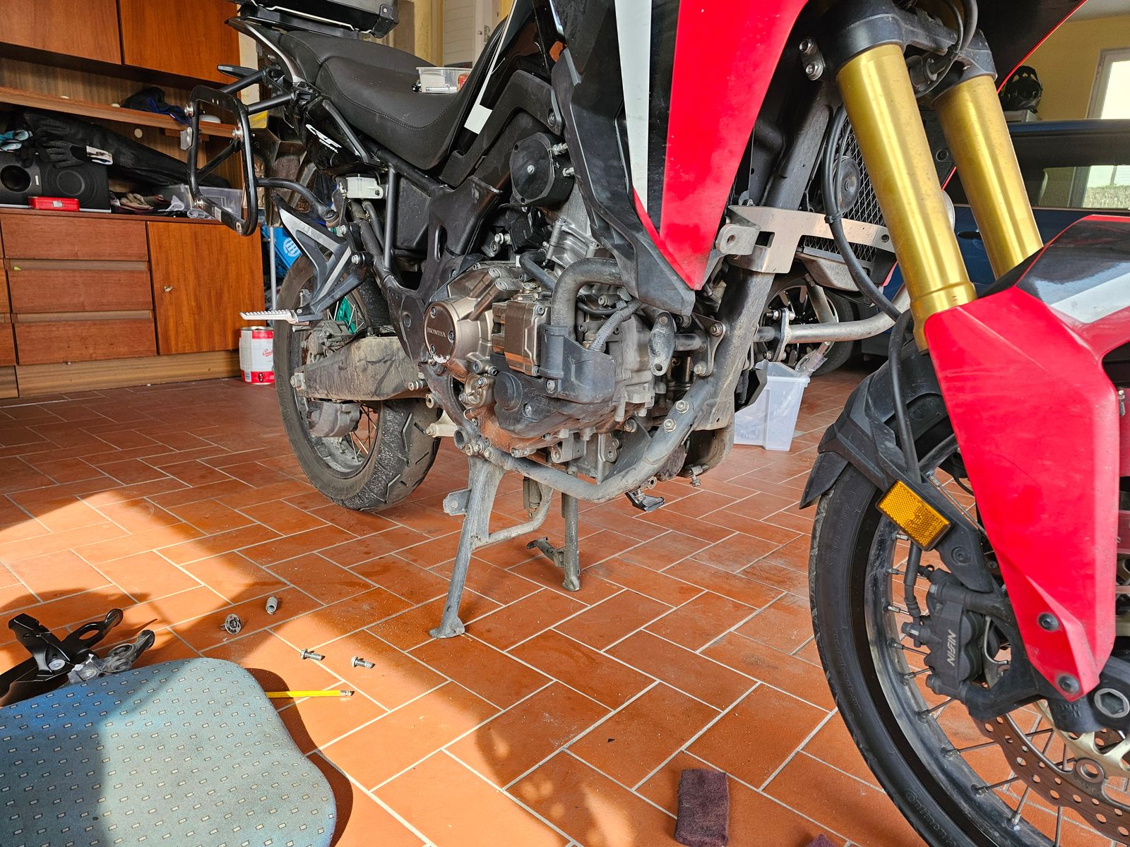 Fußrastenträger rechts ist erfolgreich getauscht. Ich dödel hab die Krümmerdichtungen nur in den Warenkorb gelegt, aber nicht bestellt. Deshalb Dienstag nochmal in mittelschwerer Panik bei Honda angerufen und bestellt + Mittwoch bekommen.