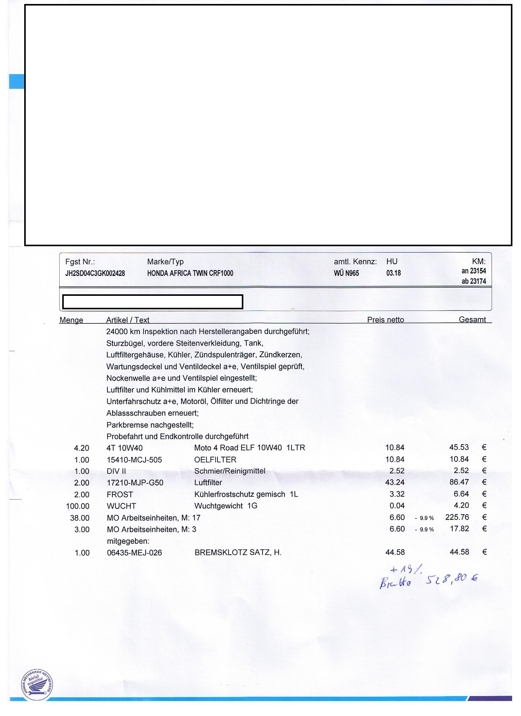 Meine Rechnung für den 24ter km Kundendienst.