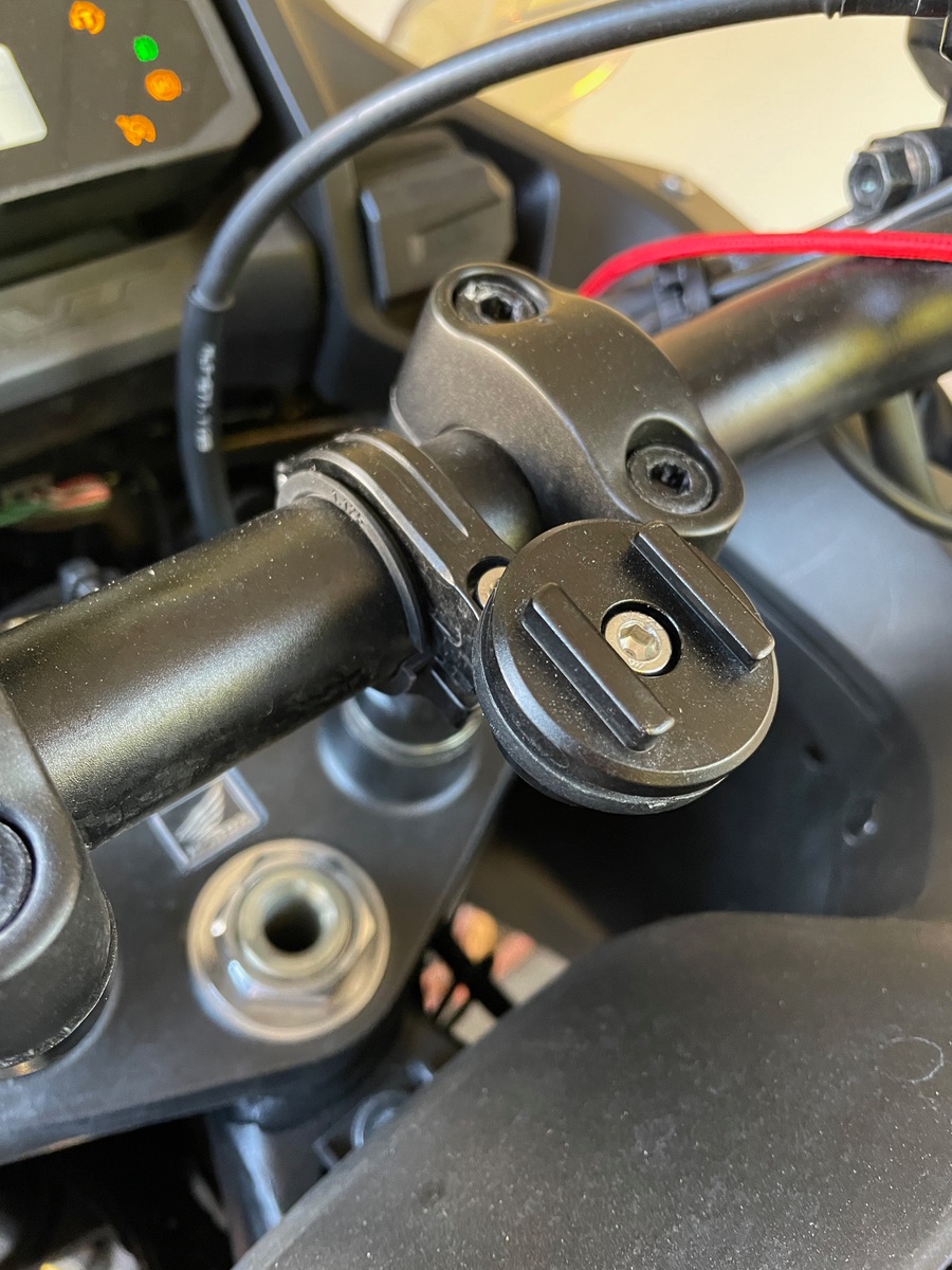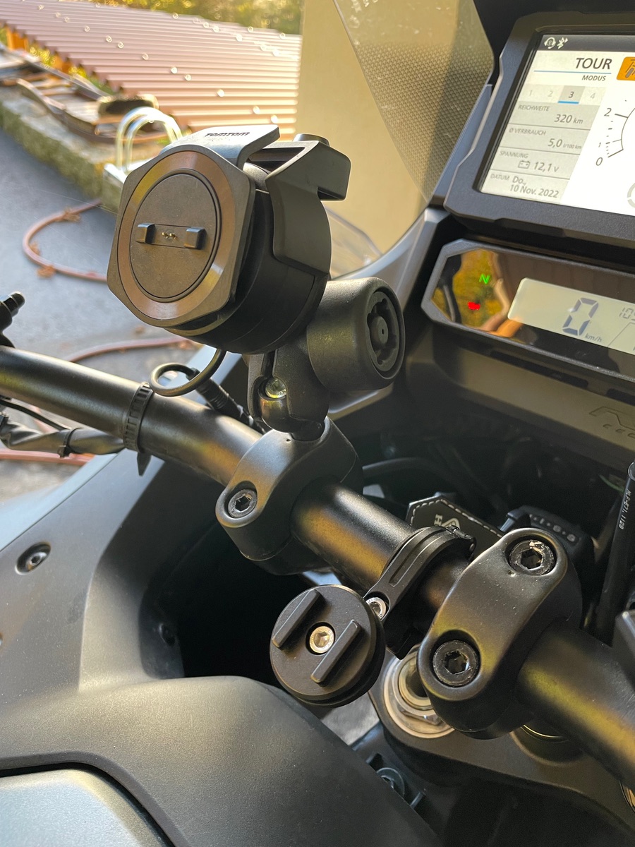 Was ich noch sagen möchte. Bevor ihr etwas für die Navimontage bestellt, überlegt genau, wo und wie ihr das Phone installieren möchtet. Die Halterung beim TomTom ist, da dieses kurze Teil vom Knubbel zum TT nicht gekröpft ist, nicht optimal. Aber ich habe einige Zeit auf dem Motorrad gesessen, um alle Display/Geräte so zu platzieren, dass die Sicht Einschränkungen minimal sind.