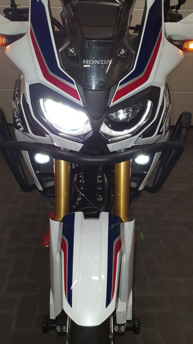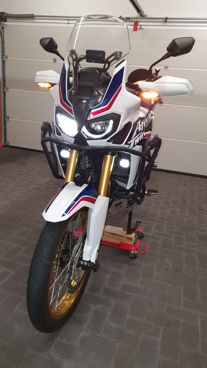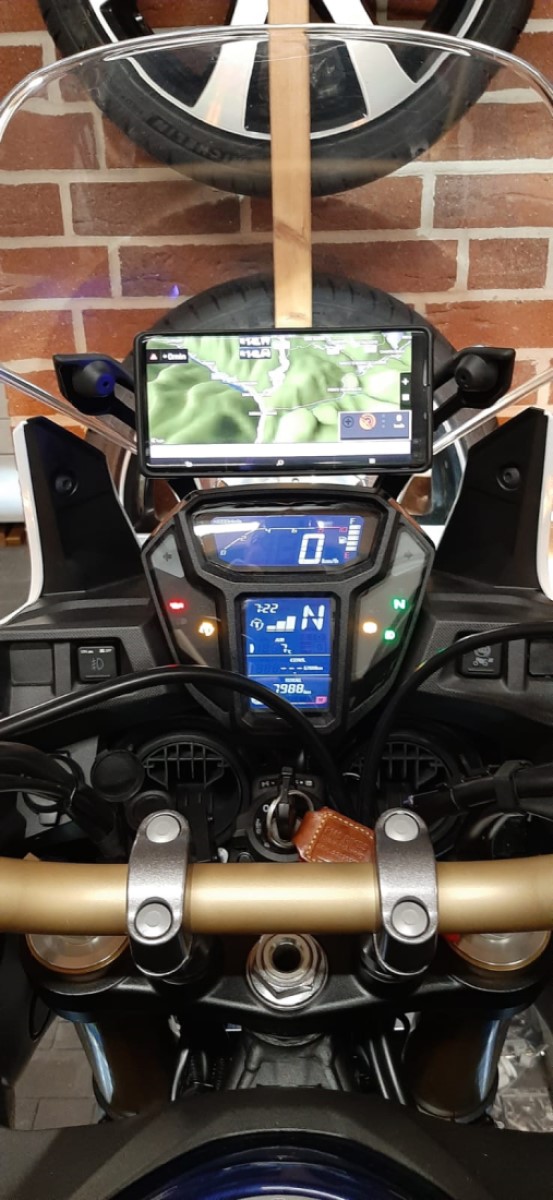 185cm / AT / mittlere Sitzbank Touratech / hohe OEM-Scheibe / Aufsatz VSA-A von MRA (tief montiert - steht oben nur 2cm über der Honda-Scheibe) / Shoei Neotec II - durch die Honda-Scheibe kommt sehr angenehmer Luftdruck auf den Körper - der Helm wird ruhig angeströmt - (fast keine Fliegen auf dem Visier
