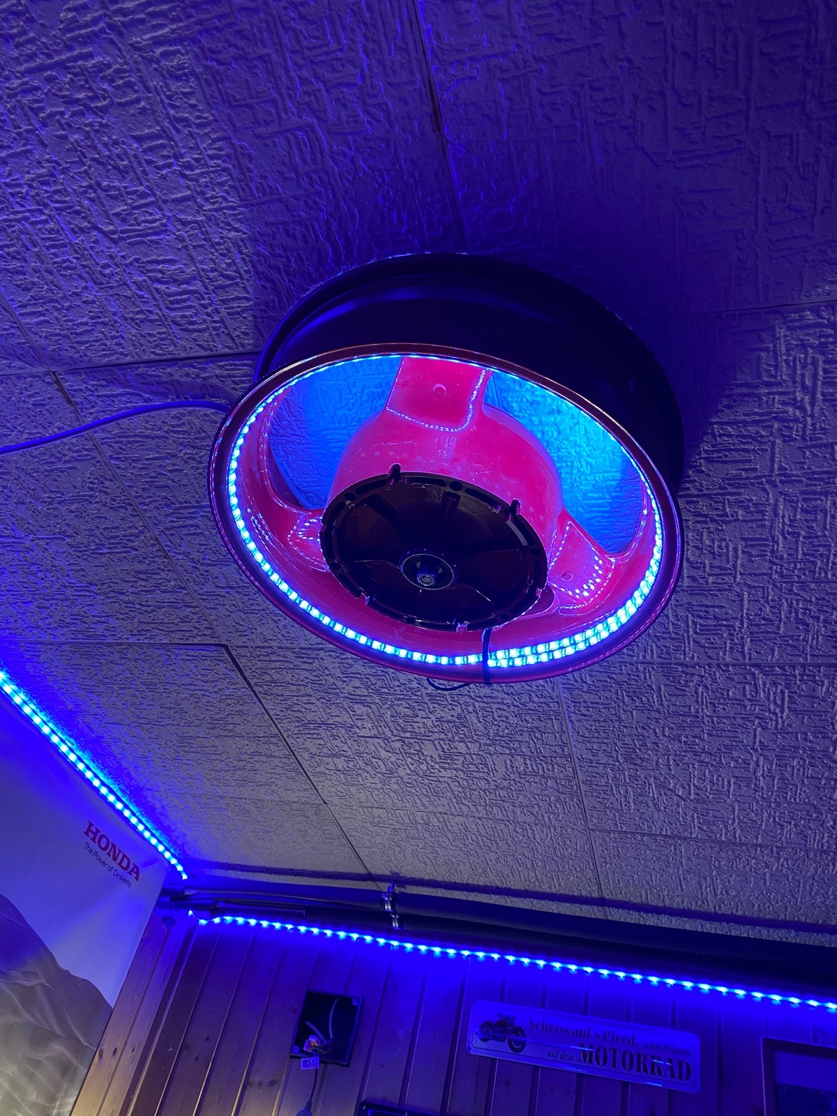 Mein Sohn macht eine Ausbildung als Mopetenschrauber. Die hatten bei Aprillia einen Rückruf von Vorderfelgen. Die mussten nicht zurück ins Werk geschickt werden. Er bringt jetzt eine aus der Arbeit mit. Dann schauen wir mal wie sich das Teil an der Decke macht.
