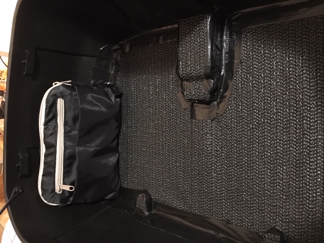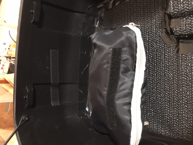 Den Boden des Topcase hab ich mit einer Anti-Rutschmatte belegt (z.B. Autozubehör für Kofferraum), zugeschnitten und mit Klebeband befestigt. Am Rand eine kleine Tasche, 'ne Art Kulturbeutel aus Nylon für 2€ aus'm Supermarkt, ein Velcroband draufgeklebt (ich hab's noch angenäht, sonst hält das nicht so gut), das Gegenstück an die Innenseite geklebt.