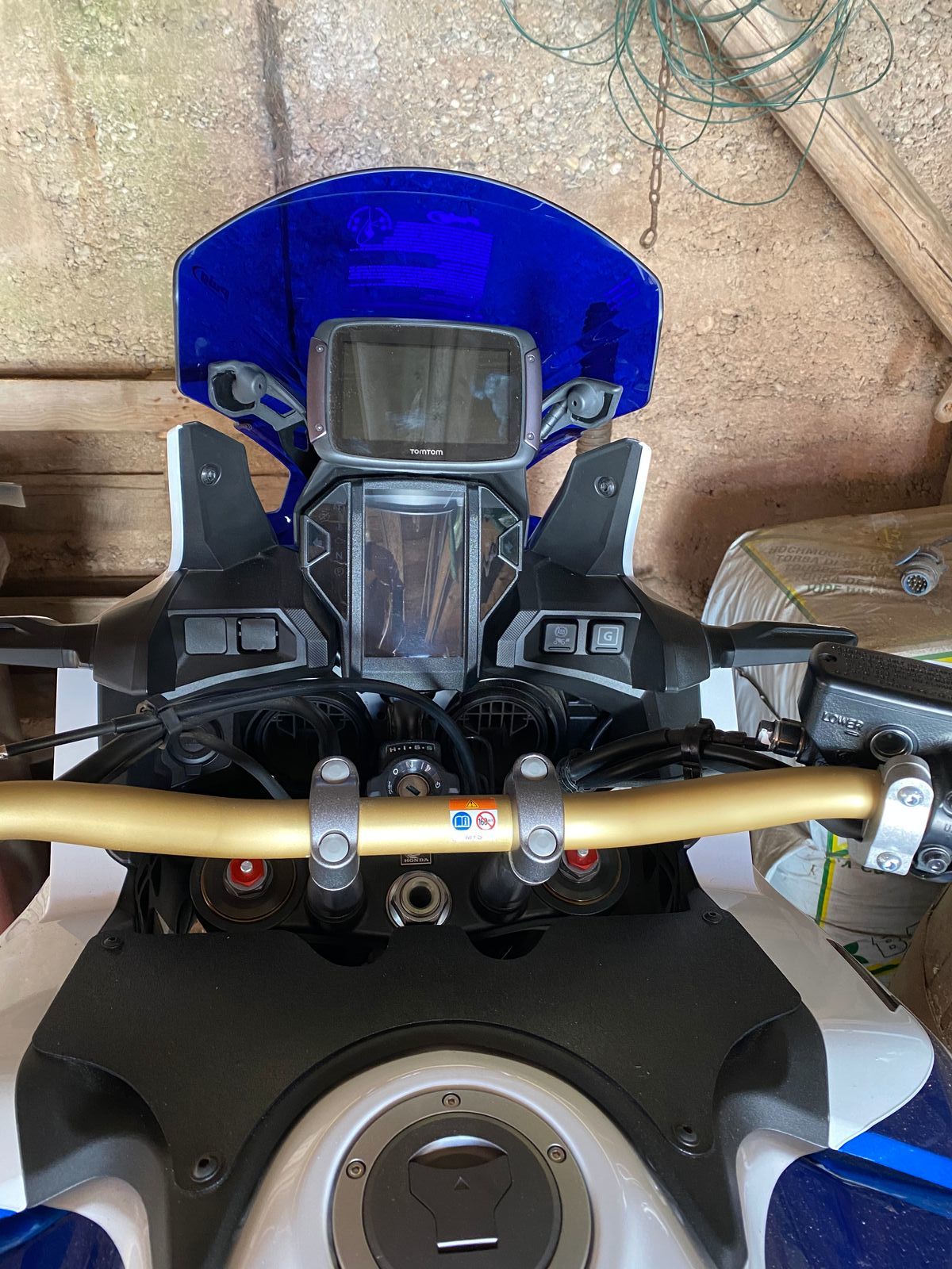 185cm / AT / mittlere Sitzbank Touratech / hohe OEM-Scheibe / Aufsatz VSA-A von MRA (tief montiert - steht oben nur 2cm über der Honda-Scheibe) / Shoei Neotec II - durch die Honda-Scheibe kommt sehr angenehmer Luftdruck auf den Körper - der Helm wird ruhig angeströmt - (fast keine Fliegen auf dem Visier