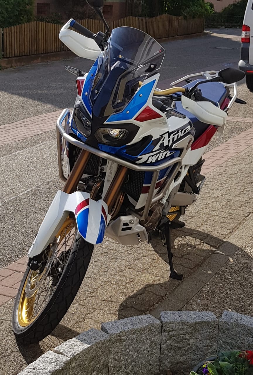 185cm / AT / mittlere Sitzbank Touratech / hohe OEM-Scheibe / Aufsatz VSA-A von MRA (tief montiert - steht oben nur 2cm über der Honda-Scheibe) / Shoei Neotec II - durch die Honda-Scheibe kommt sehr angenehmer Luftdruck auf den Körper - der Helm wird ruhig angeströmt - (fast keine Fliegen auf dem Visier