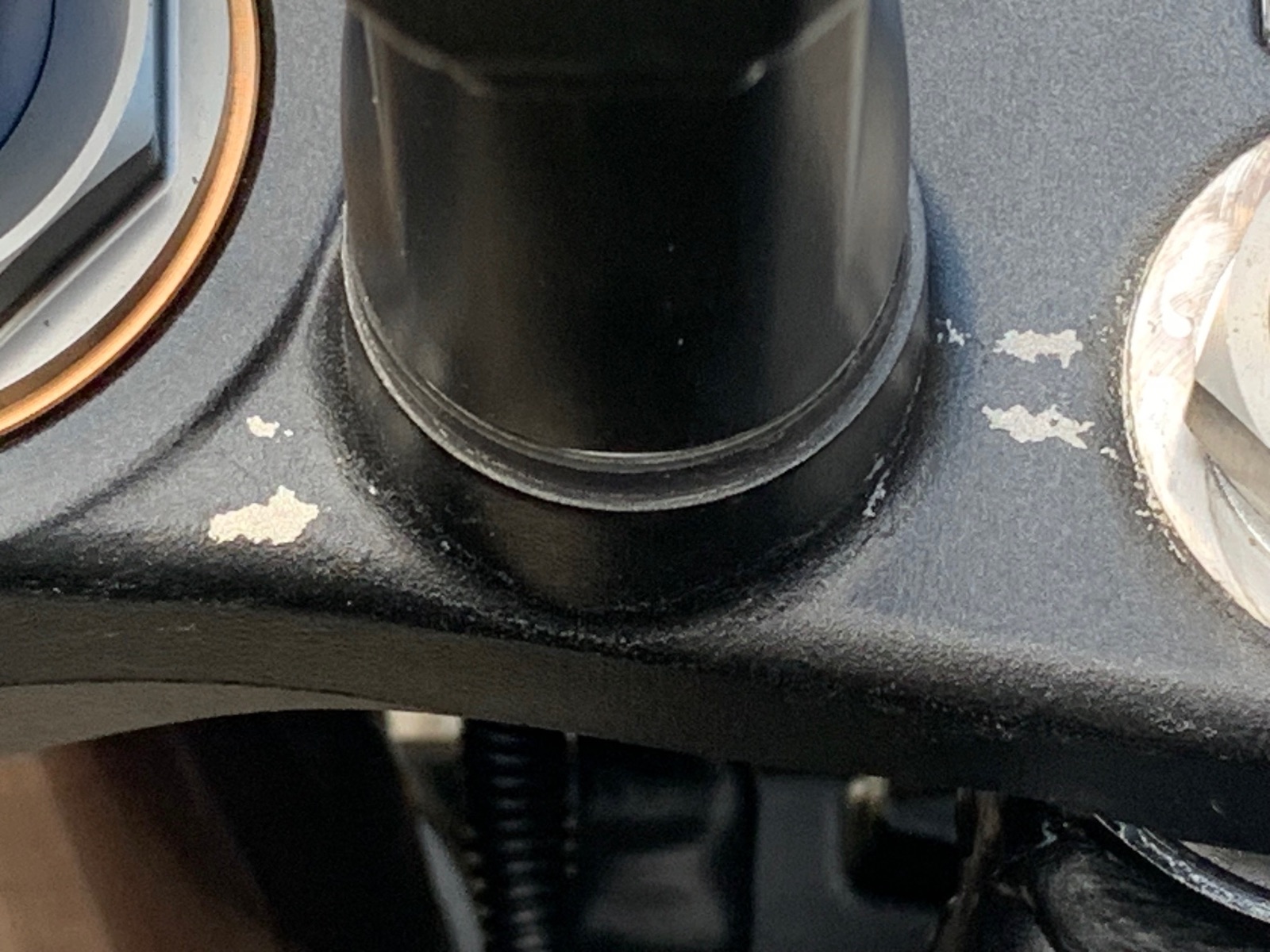 Mir sind leichte Lackerhebungen aufgefallen als ich die obere Gabelbrücke genauer angesehen habe, bin dann vorsichtig mit dem Fingernagel drüber und ach du Schreck da löste sich auch schon der Lack ab?