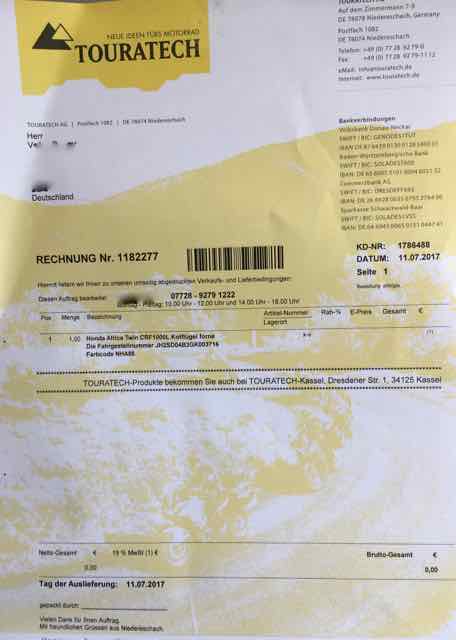 Nichts hat so geklappt, wie mit Touratech abgesprochen und wurde nur nach Androhung der Hinzuziehung eines Anwaltes durchgeführt. Ein Riesen Danke gebührt den beiden Mitarbeitern im Touratech-Shop Kassel, die sich wirklich toll verhalten und mir geholfen haben.