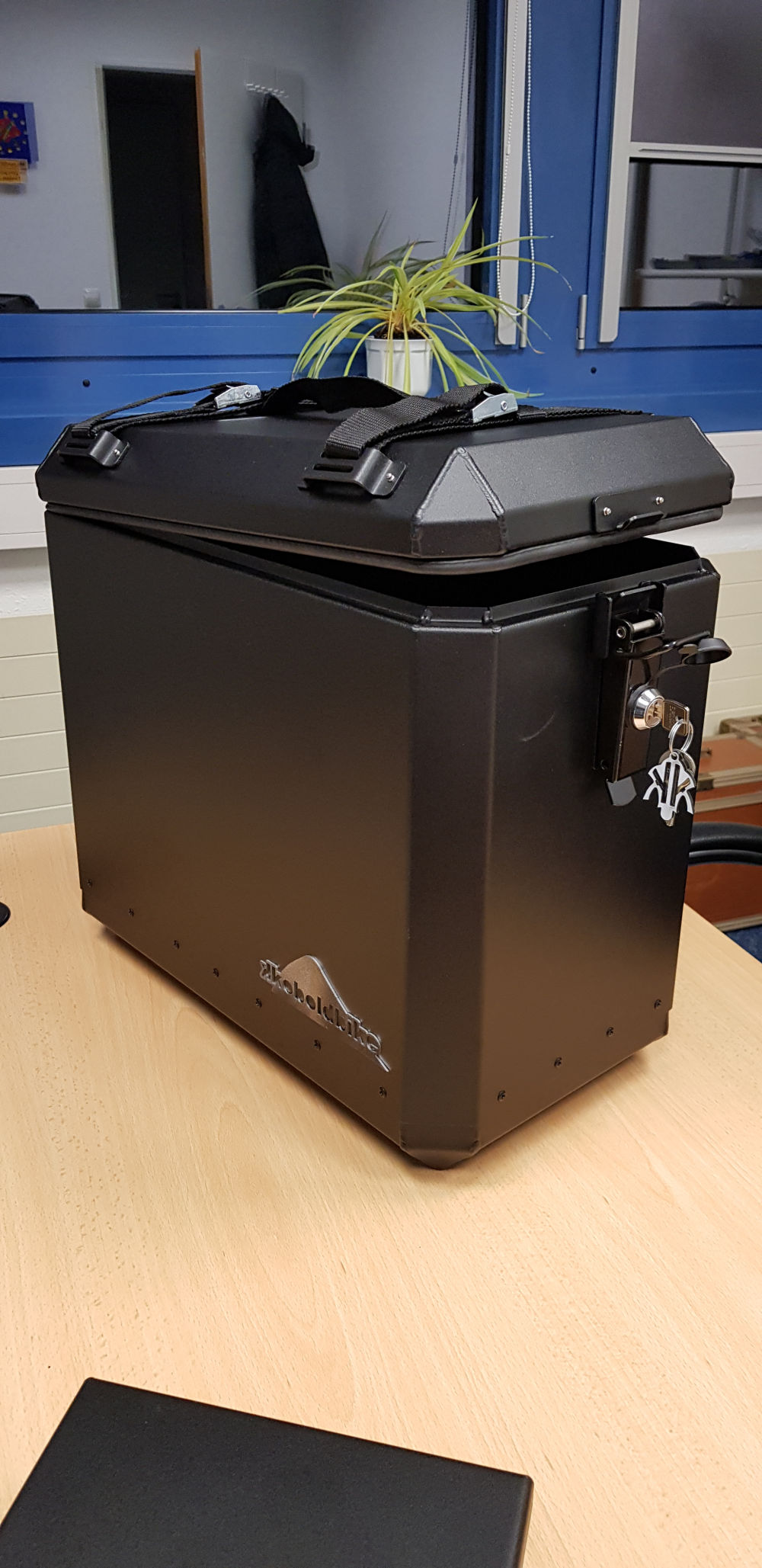 - Koffer Koboldbike 40/50 ltr schwarz, einer leicht eingebeult mit Innentaschen, Werkzeugbox.