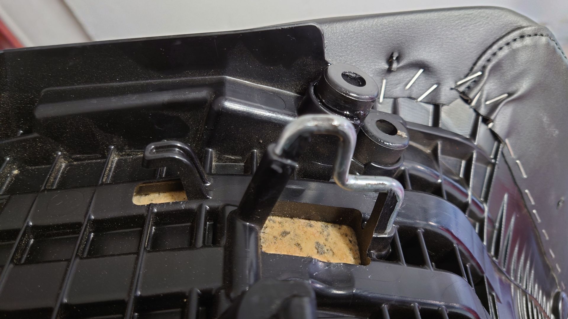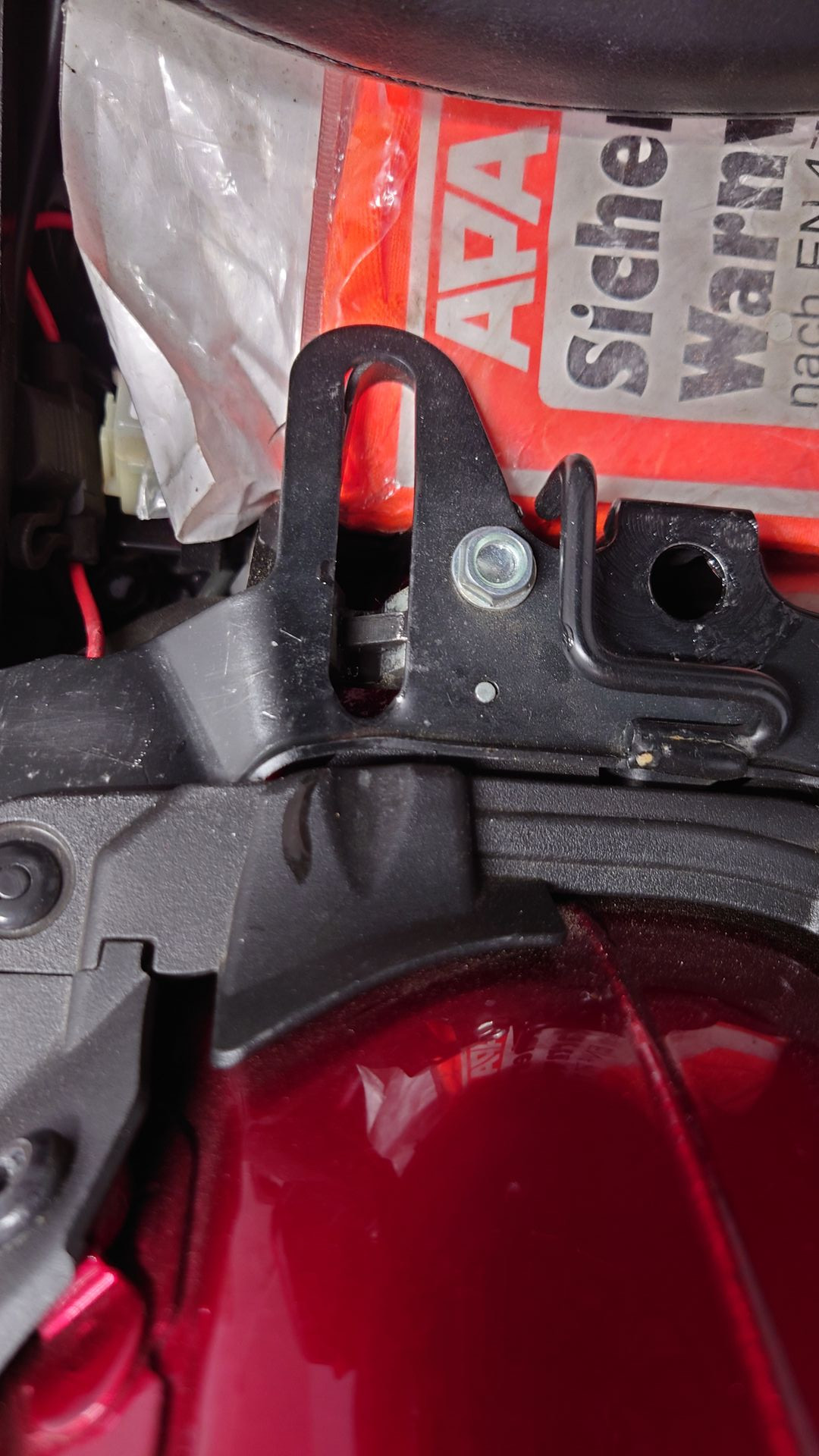 Habe den Fehler jetzt glaube ich gefunden, da wo die Sitzbank einrastet habe ich ein paar Tropfen Oel unter den Verschluss da wo der Haken aufsitzt tropfen lassen. Der Haken ( siehe Bilder) sitzt unten auf und bei Belastung verursacht er das Knarzen.
