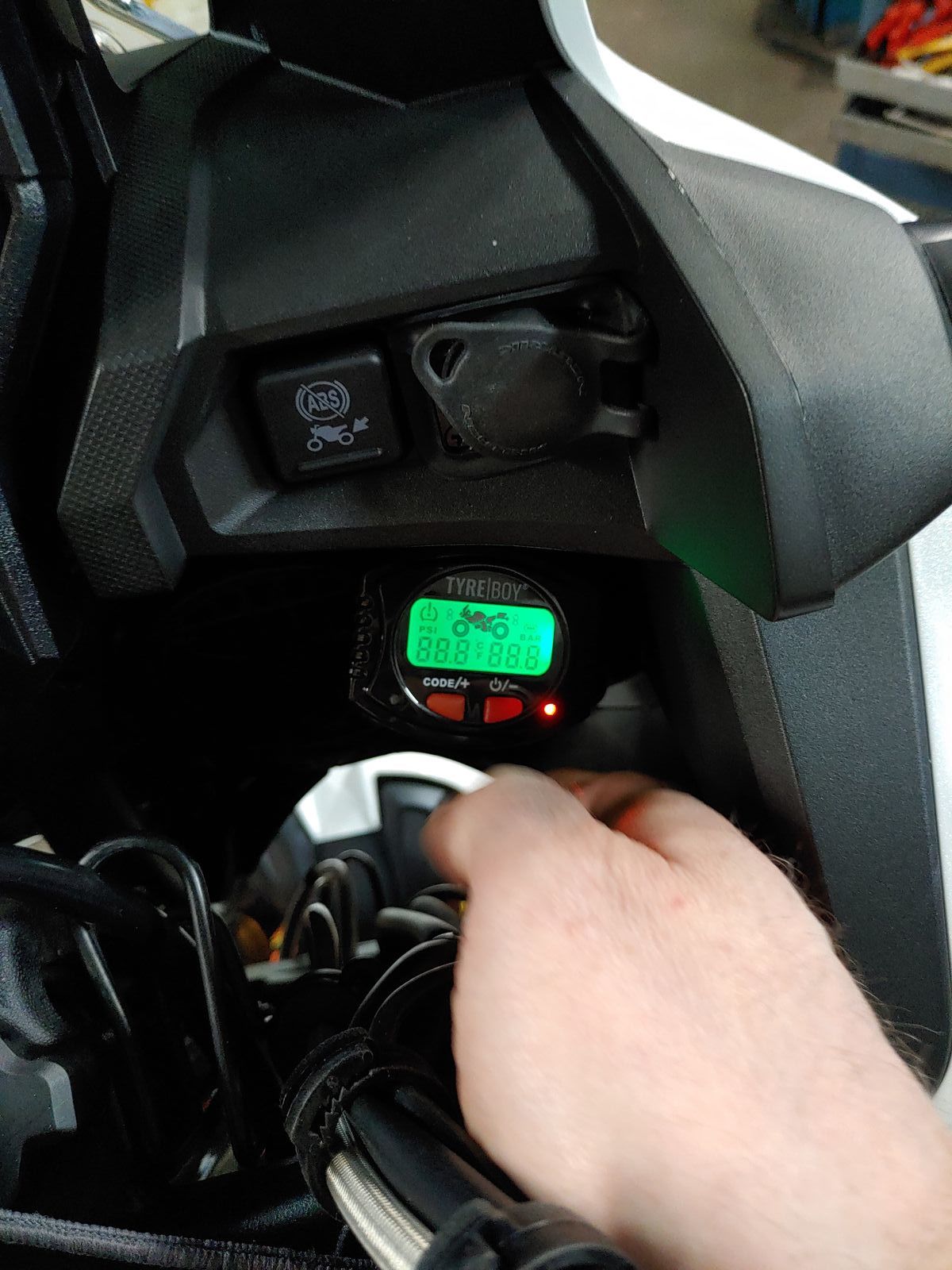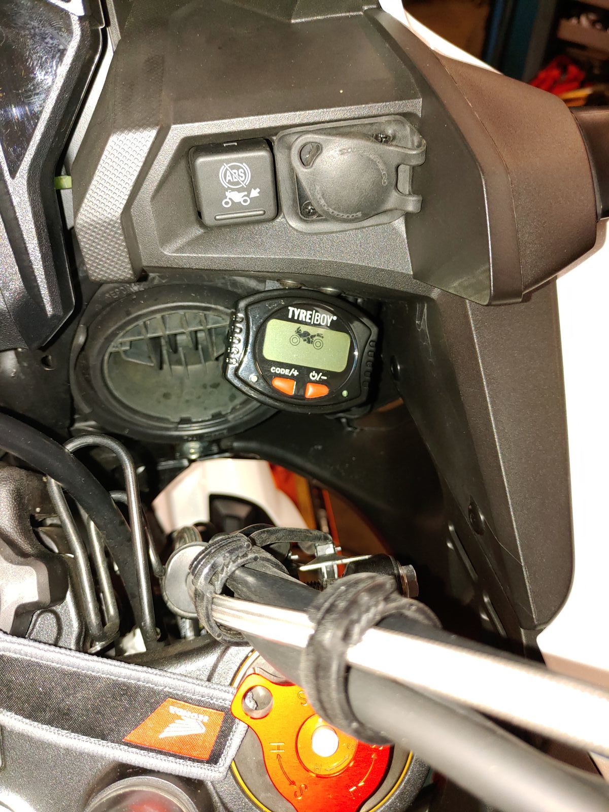 der Tyre Boy wird uber einen USB Dose geladen. Bei meiner Anbringung kann ich das übers moped mit einem kurzen Kabel an der darüberligeneden Dose während der Fahrt laden.