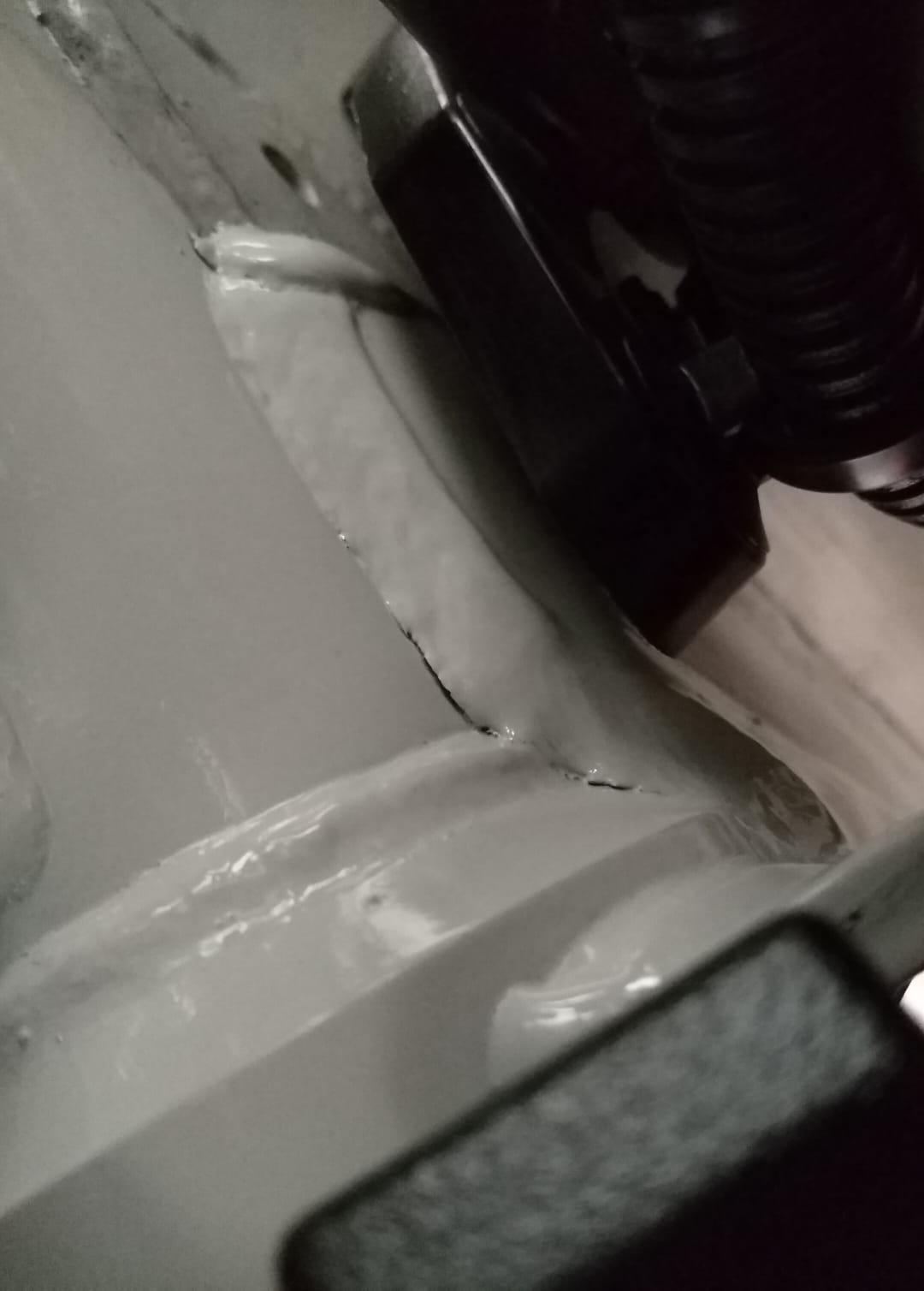 Der Riss/Spalt ist in bzw. unter der Schweißnaht. Sieht aus, als hätte sich das Metall nicht richtig verbunden.