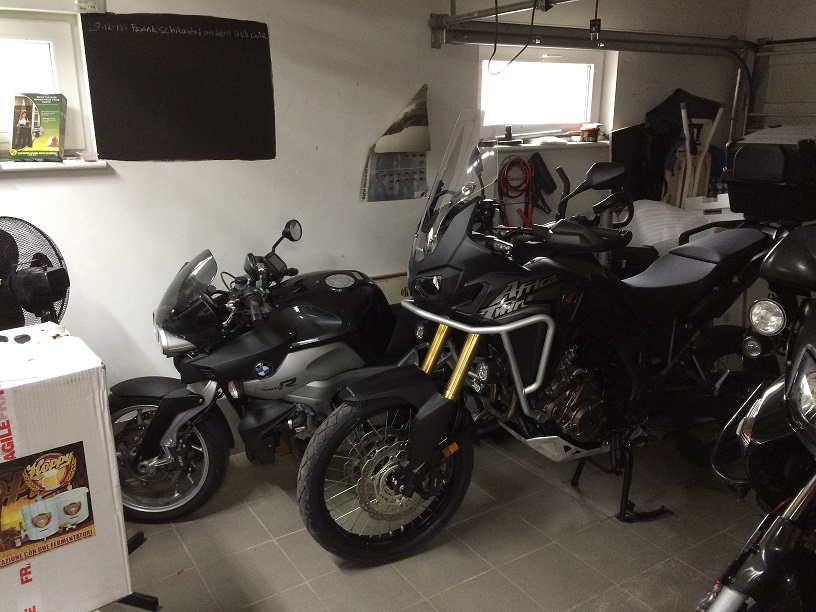 Auch hier bei mir in der Garage ist der Grössenunterschied zwischen der CRF1000D und BMW K1200R auch ziemlich auffällig. ![]()