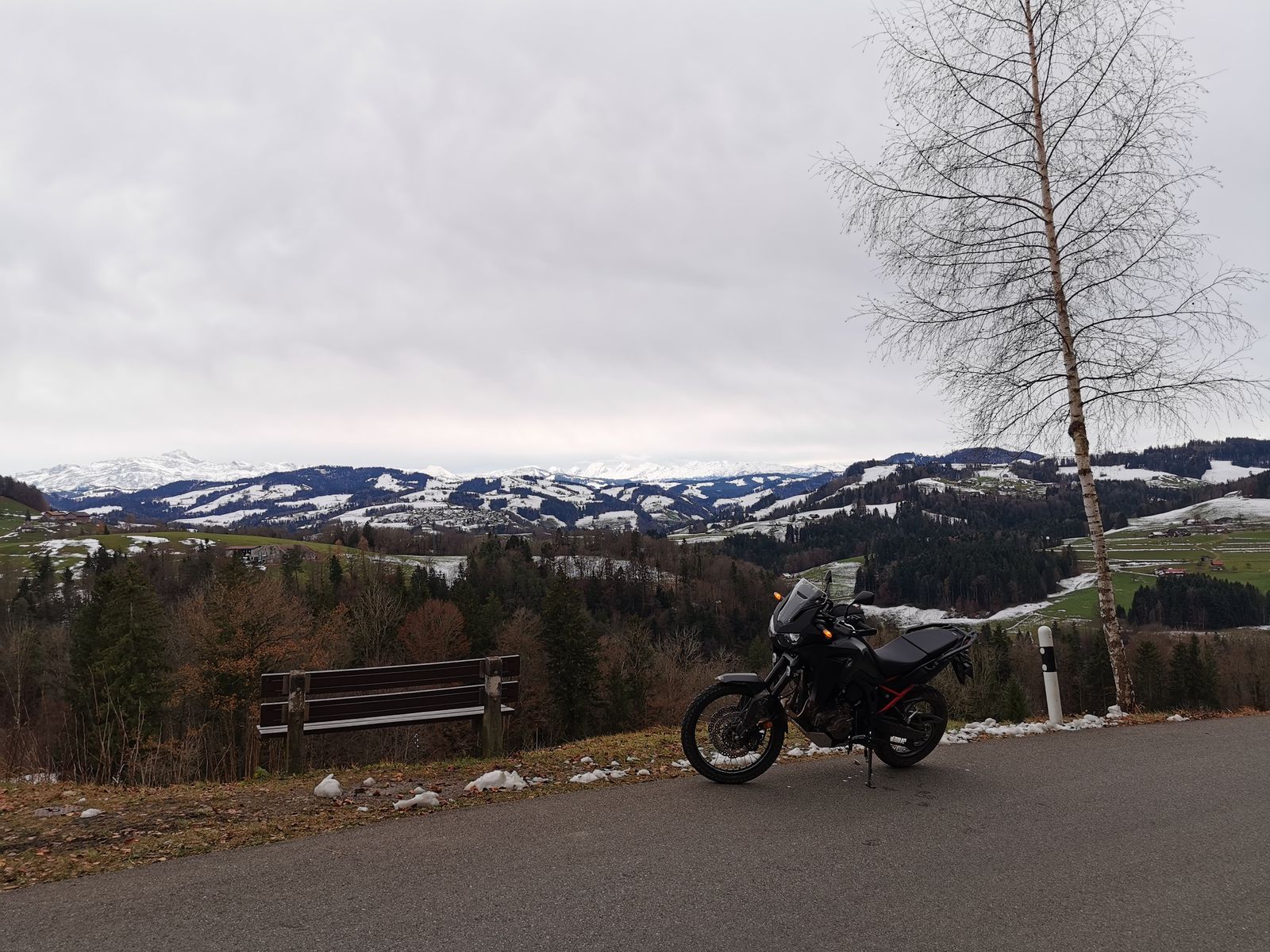 Hier etwas Sonnenschein, blauen Himmel und im Hintergrund unser Hausberg Säntis mit Schnee für unseren Berliner. Die letzten drei Tage bestes Motorradwetter - sofern Mann keine Frostbeule ist. 6 bis 12Grad ist doch was für Anfangs Februar 😄