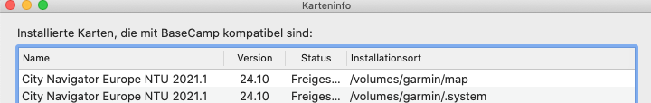 Ich habe mir schon etliche YT Videos angeschaut, immer stolpere ich über eine Ansicht in Garmin Express mit "Karte auch auf PC installieren" etc. Bei mir finde ich aber diesen Punkt nicht (siehe Bild). Ich habe mir die Videos zu Basecamp von Valle on Tour angeschaut, dabei habe ich gesehen, bei ihm ist die Karte richtig installiert (im Userverzeichnis), bei mir im Ordner Volume, der ja immer ausgeworfen wird, wenn ich das Navi vom Mac trenne. (siehe die Screenshots von meinem BC und von Valles BC.