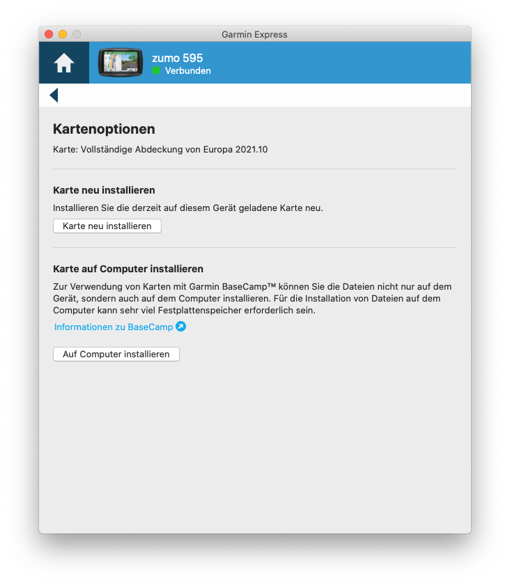 Ich habe mir schon etliche YT Videos angeschaut, immer stolpere ich über eine Ansicht in Garmin Express mit "Karte auch auf PC installieren" etc. Bei mir finde ich aber diesen Punkt nicht (siehe Bild). Ich habe mir die Videos zu Basecamp von Valle on Tour angeschaut, dabei habe ich gesehen, bei ihm ist die Karte richtig installiert (im Userverzeichnis), bei mir im Ordner Volume, der ja immer ausgeworfen wird, wenn ich das Navi vom Mac trenne. (siehe die Screenshots von meinem BC und von Valles BC.