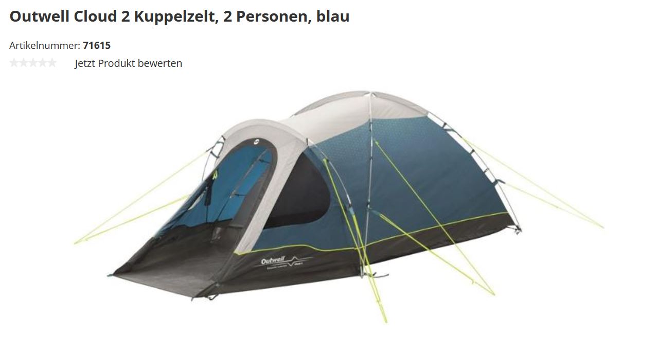 hier ist mein Zelt- Outwell Cloud 2. Bin mit Outwell Zelten schon seit Jahren unterwegs, sehr gute Qualität, zwei Eingänge, sehr robust, hat viel Platz. Ist halt nicht Federgewicht (4,5kg), aber ich trage die nicht. Hier ist noch der Pres-Leistung Verhältnis unschlagbar. Ich habe meine sogar für 68 erworben.