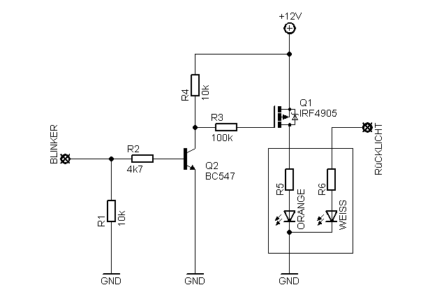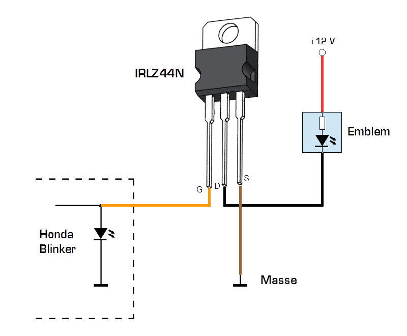 Schließt Du die Schaltung an die hinteren Blinker an, so blinken sie normal mit. Schließt Du sie an die vorderen Blinker, leuchten sie gedimmt als Positionslicht, so wie die vorderen Blinker. Der Gate Eingang des MOSFETs ist so hochohmig, dass die Funktion des Blinker-Steuergerätes nicht gestört wird.