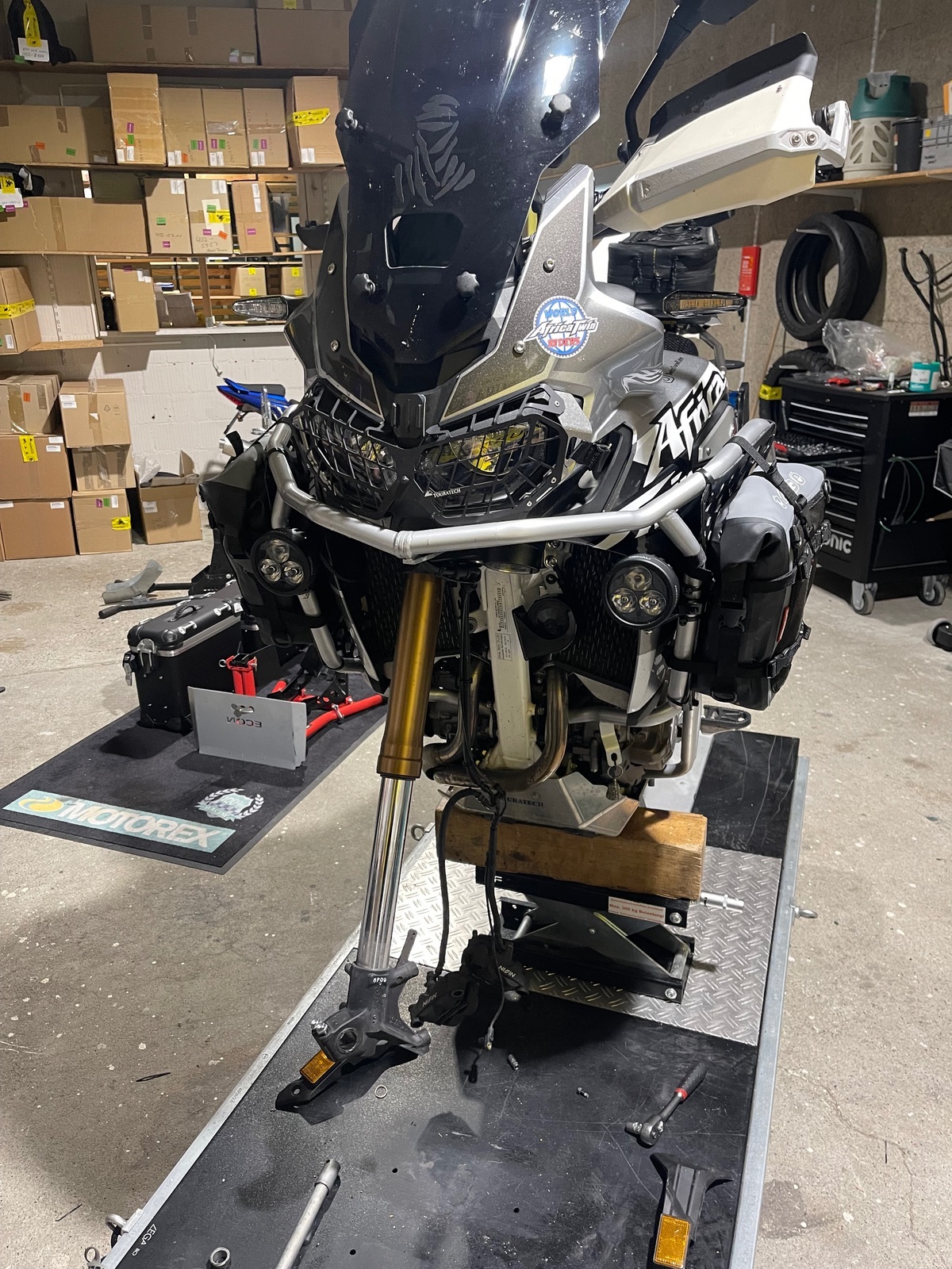 Gab die progressiven Federn von Touratech (Hyperpro). Konnte noch nicht viel testen (nur den Weg zurück nach Hause), aber fährt sich definitiv anders. Das Eintauchen ist minimiert, liegt gefühlt „satter“ auf der Strasse. Kurven machen definitiv mehr Spass… mehr kann ich noch nicht berichten.