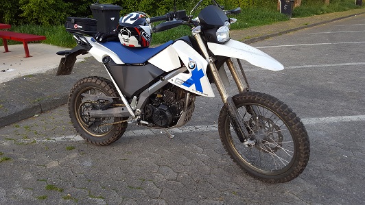Eine BMW G650XChallenge von 2008. Sehr handlich, geländetauglich und trotzdem auch für Tagestouren zu gebrauchen.