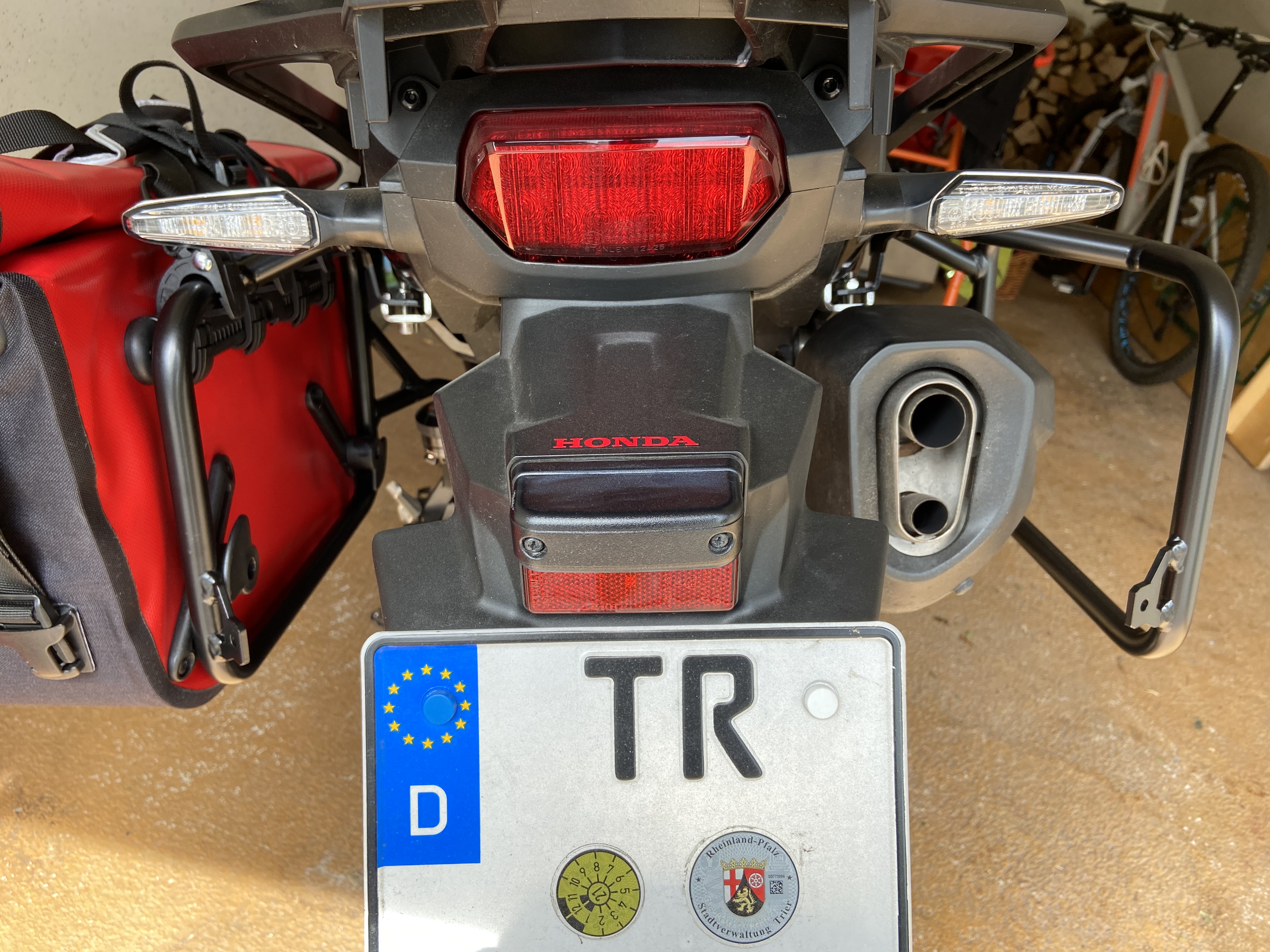 Aber dann kam der hintere Bügel und der passt gar nicht. Habe dann mit einem freundlichen Herrn von Touratech telefoniert. Er meinte, das hätte er noch nie gehabt, aber er würde mir mal einen neuen Bügel zuschicken. Dieser kam heute und er ist absolut identisch und passt natürlich auch nicht. Jetzt frage ich mich natürlich, habe ich irgendwas falsch montiert? Aber eigentlich gibt es da ja nicht viel falsch zu machen. Der hintere Bügel stößt auch am Kennzeichenhalter an.