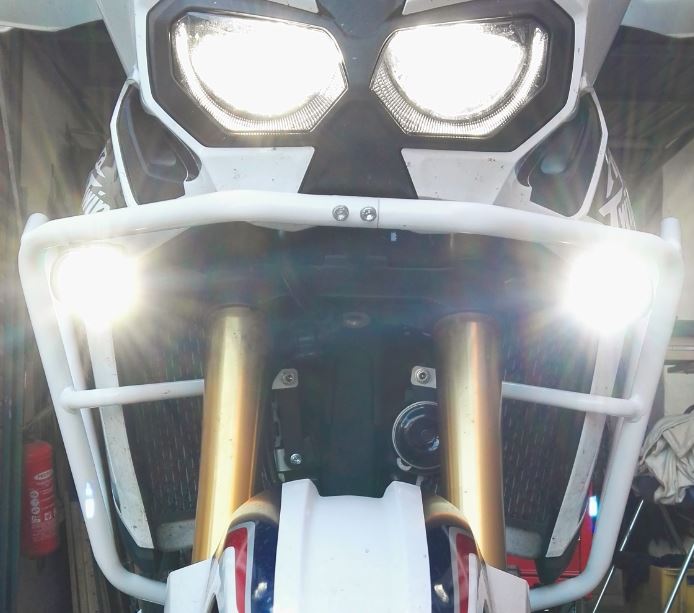 Gut gefällt mir an den AQ- resp. Holan-Bügeln, dass schon Gewinde zur Montage von Zusatzscheinwerfern eingelassen sind. Da mir diese Riesen-Scheinwerfer von Givi oder SW Motech nicht gefallen, habe ich kleine LED-Scheinwerfer von Highsider montiert.
