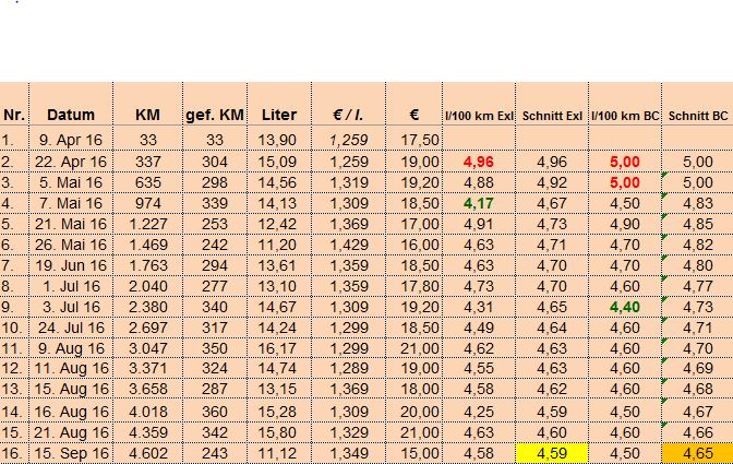 Der Mittelwert meiner Exel-Tabelle zeigt nach 15 Mal tanken 4,59 l/100 km;