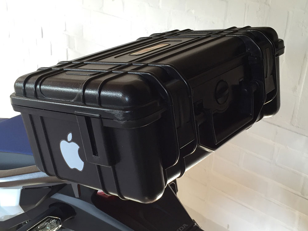 Hier mal meine Lösung, im Tankrucksack bekomme ich sogar meine SLR Kamera mit Reisezoom verpackt. Der kleine Koffer ist wasserdicht und abschließbar. Das zweite Bild zeigt den Abstand bei vollem Lenkeinschlag. Ich versuche aber noch die beiden Gurte nicht seitlich sondern unterm Sitz zu befestigen.