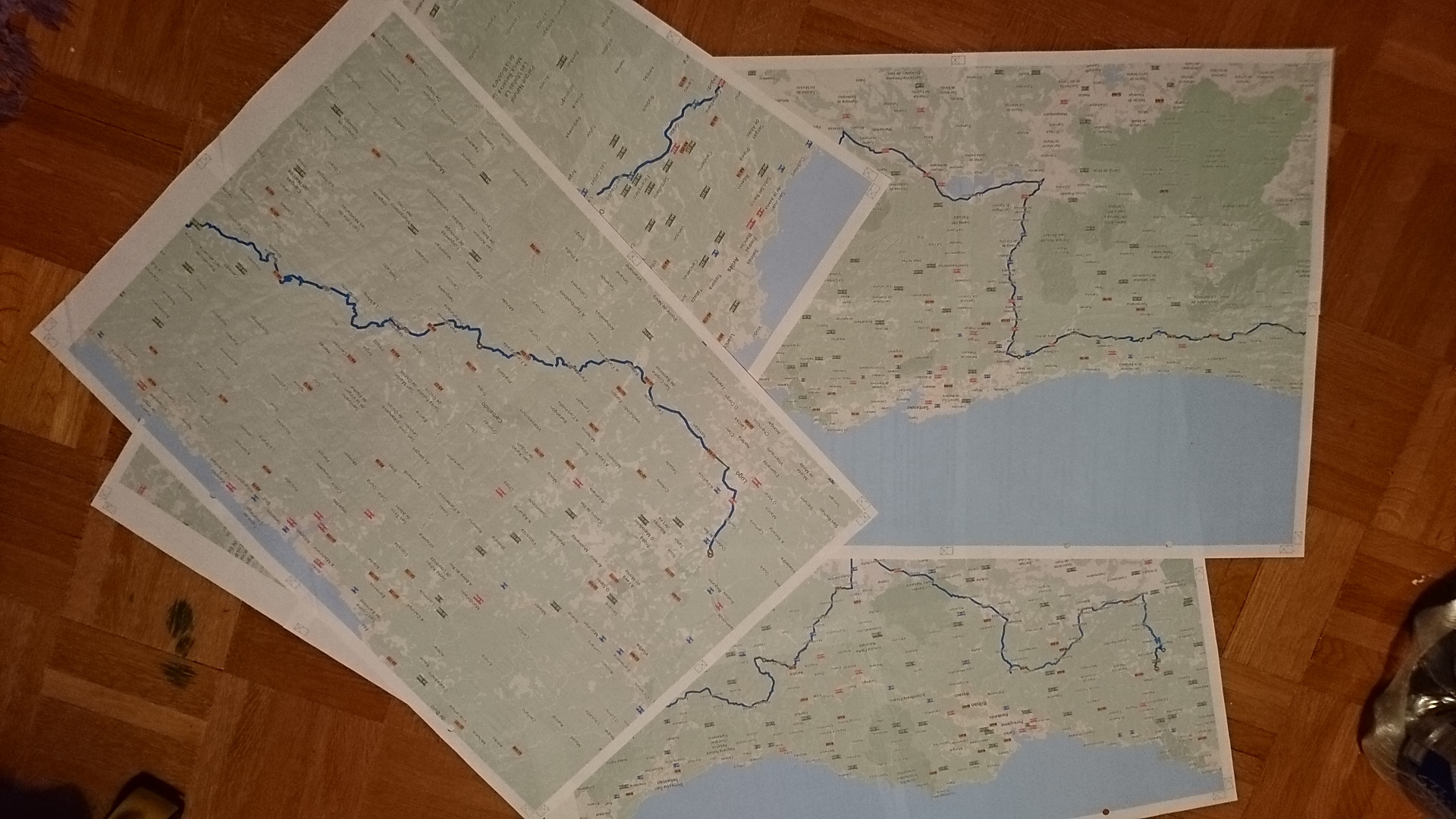 Eine Tagesetappe auf zwei A3 Seiten in WORD, ausgedruckt als "Poster" auf 4 A4 Blätter (A2), damit man auch die Orte der Route lesen kann....