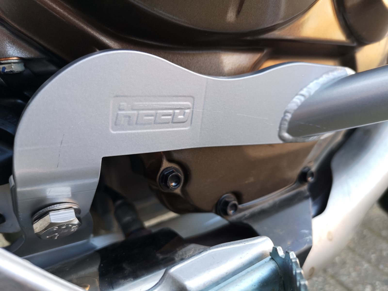 Da wo das Rohr in die Platte mündet, ist auf der anderen Seite zum Motorgehäuse ein runder Gummipuffer befestigt, der bei Holgis Bügel ziemlich plan am Motorgehäuse anliegt.