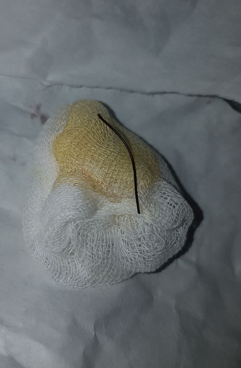 Dann zeigt mir der Arzt den Draht und dem Draht den Stinkefinger