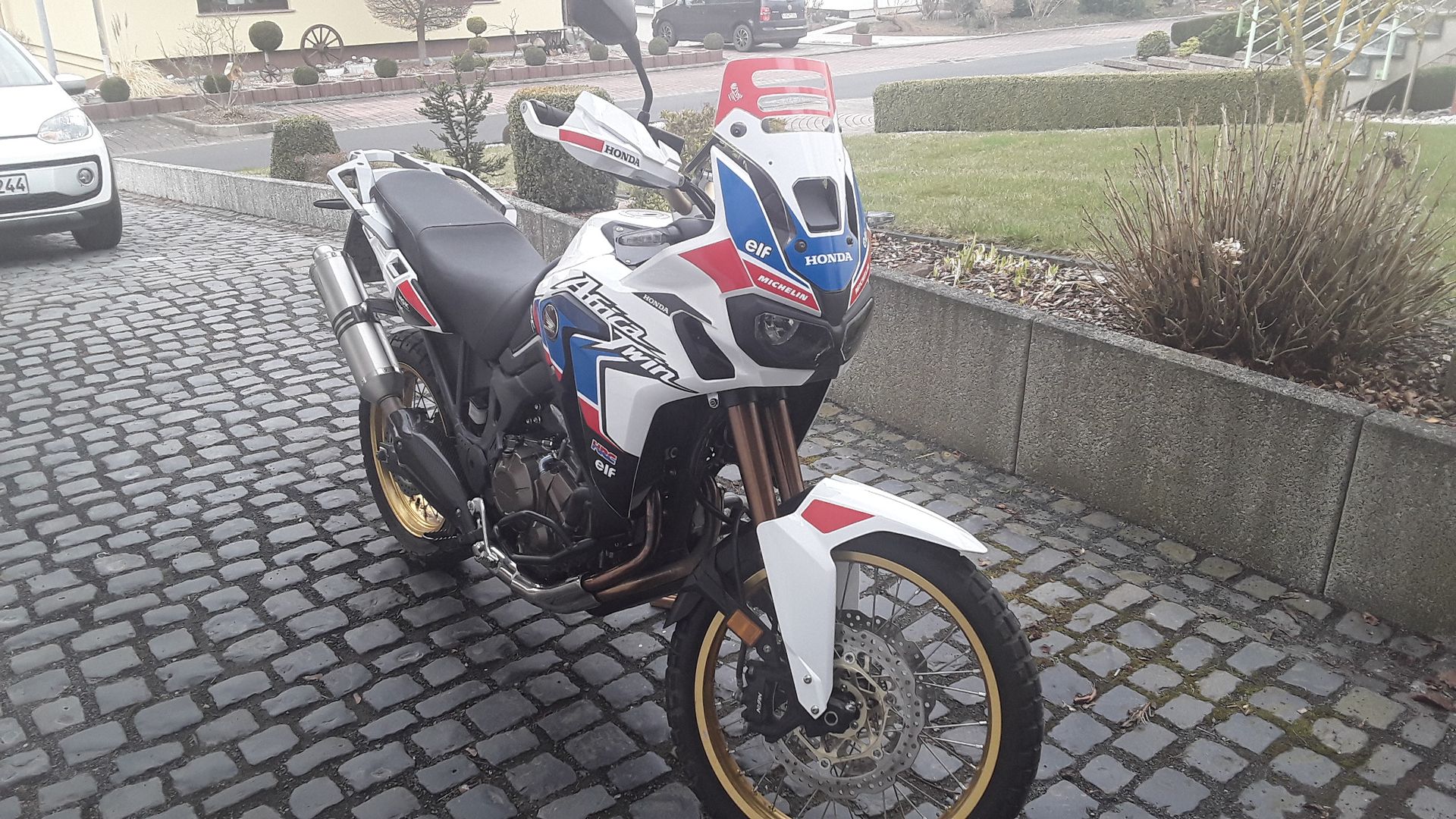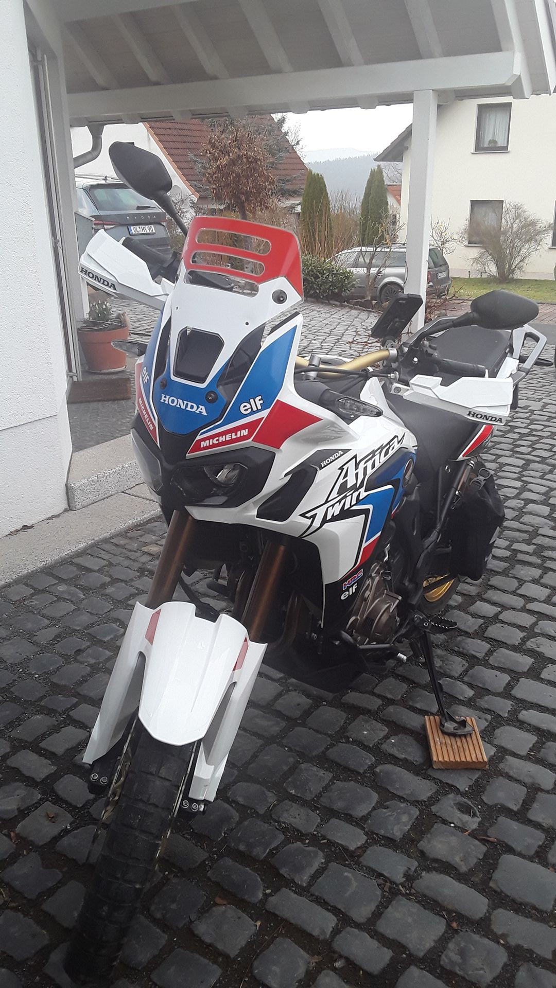 Dann habe ich sie weiß lackieren lassen als Grundfarbe. Stickerbogen drauf. Mir gefällt sie sensationell. Habe dann noch die obere Hälfte vom Schild mit rot machen lassen und die Handschützer dezent gestaltet. Nun ja mir gefällt's.