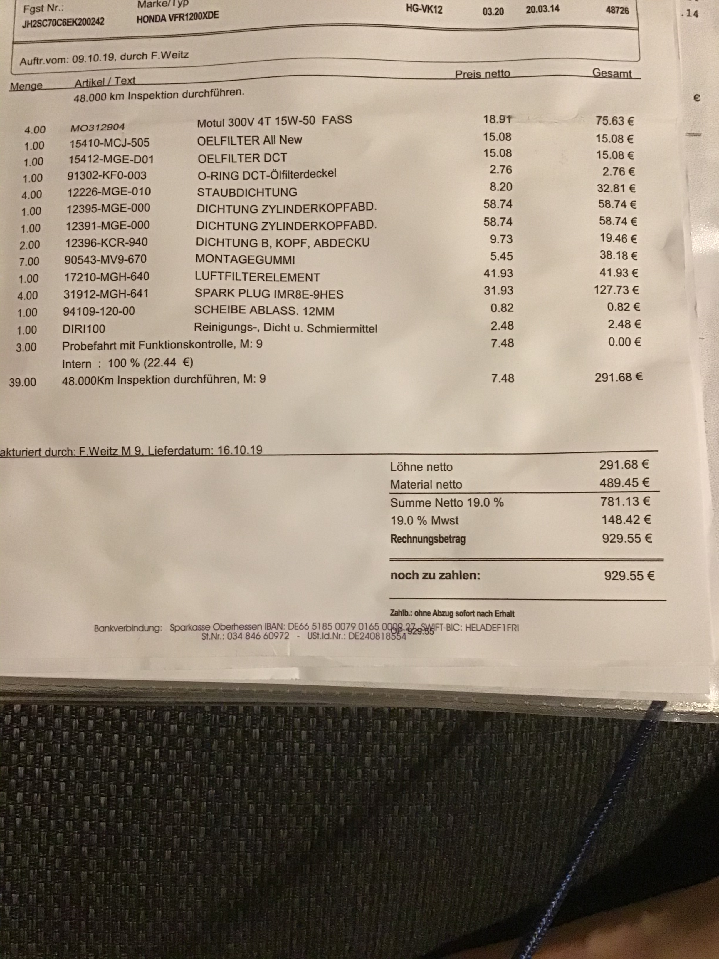 Richtig, Crosstourer, ich dachte das die die mich schon kennen das wüssten. Hatte aber auch dazu geschrieben das das mit ein Grund war das Model zu wechseln. Weil eben auch V4 Motor. Der Händler hatte bei der 24000er die Ventildeckeldichtung noch mal benutzt um Kosten zu sparen. Da aber nun mussten neue drauf. Dann noch die 4 Zündkerzen die auch kein Schnäppchen waren. Aber wie man sieht, Lohnkosten waren gar nicht so hoch. Material und Vater Staat sind die Übeltäter.