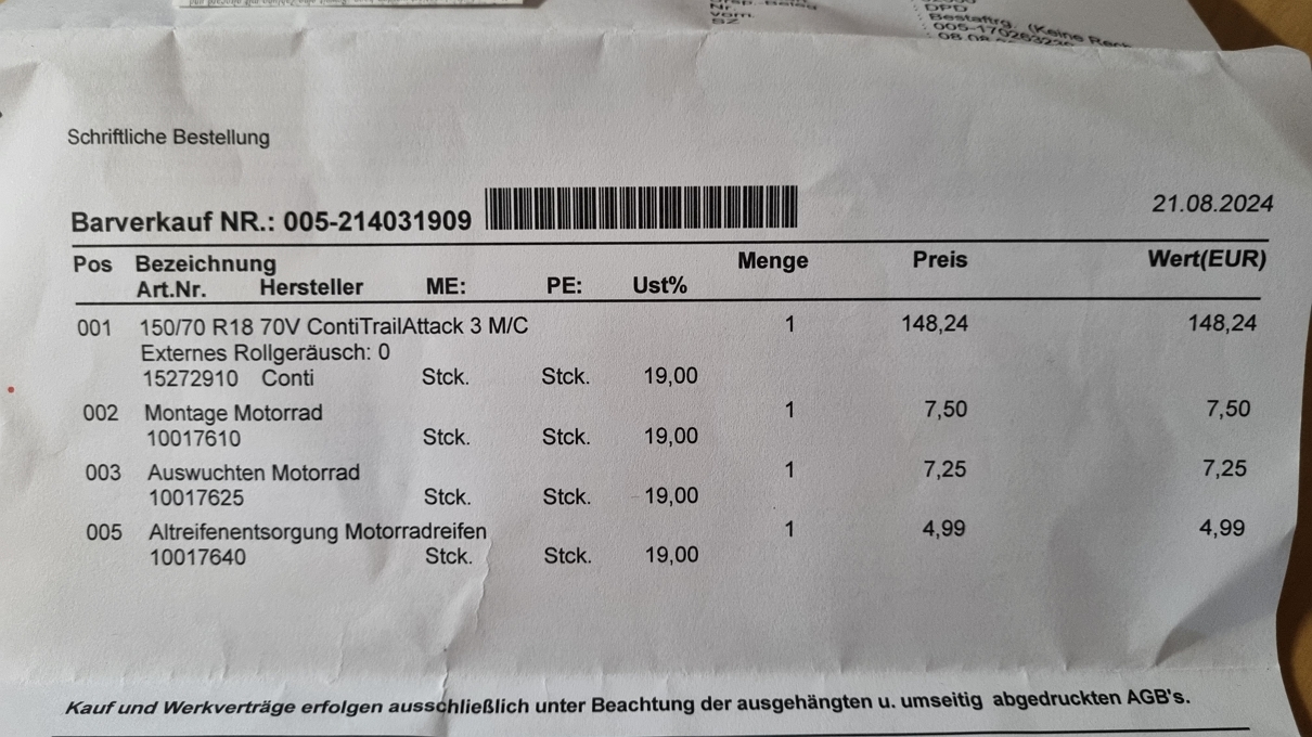 Reifen online bestellt, zur Werkstatt liefern lassen, Rad hingetragen, neuen Schlauch beigelegt, spazieren gegangen und Rad wieder rausgeholt...incl. heilem Altschlauch zur Reserve für ´ne Panne unterwegs...