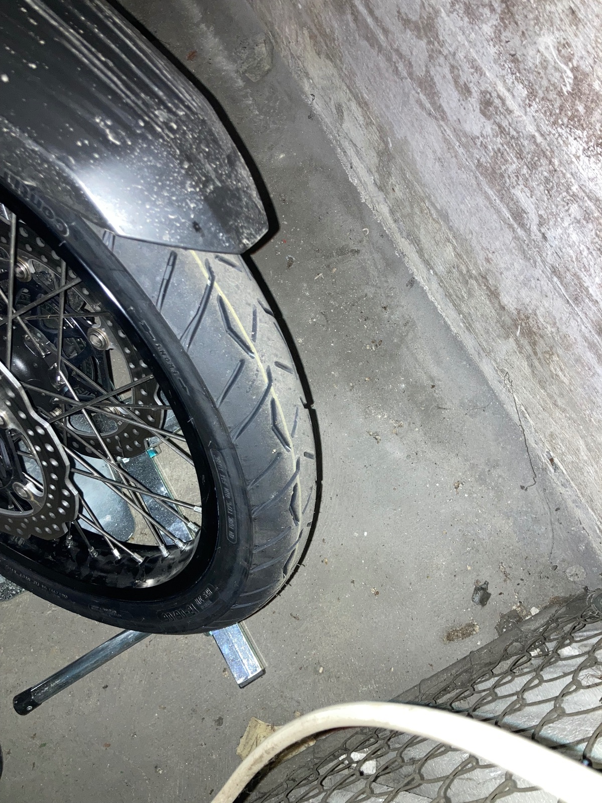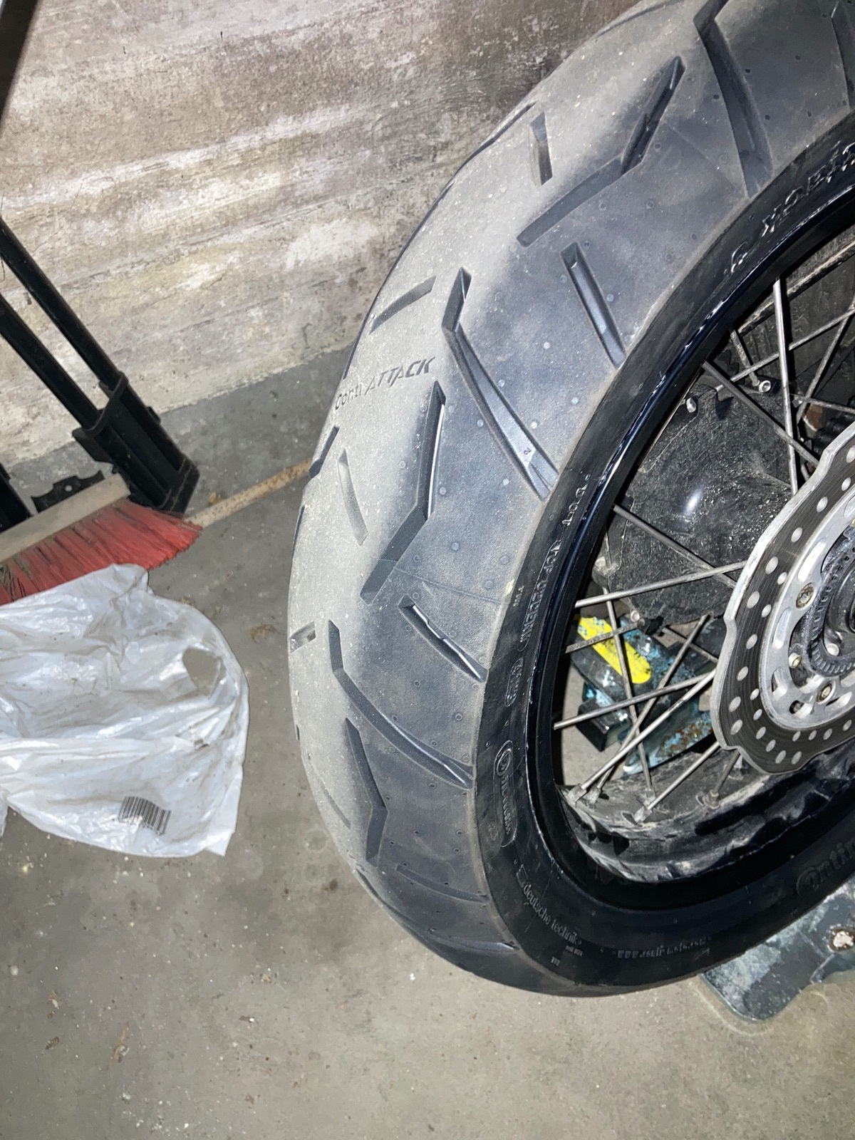 Vor zwei Monaten war bei 5.000 km der Vorderreifen der Erstbereifung meiner SD08 endgültig jenseits der StVO. Hinten sah eigentlich noch ganz gut aus, also habe ich den AX41T vorn gegen einen neuen AX41 ohne T ausgetauscht (den AX41T gibt es im freien Handel offenbar nicht mehr). Da hätte ich wohl besser nochmal genauer hingesehen, denn nach weniger als 1.200 km mehr ist jetzt auch der Hinterreifen an der Grenze gewesen. Trotz der Kombination aus neuem Vorderreifen mit Stollen und hinten nahezu Glatze fuhr sich das Ganze eigentlich ganz okay, aber lassen kann man das natürlich nicht.