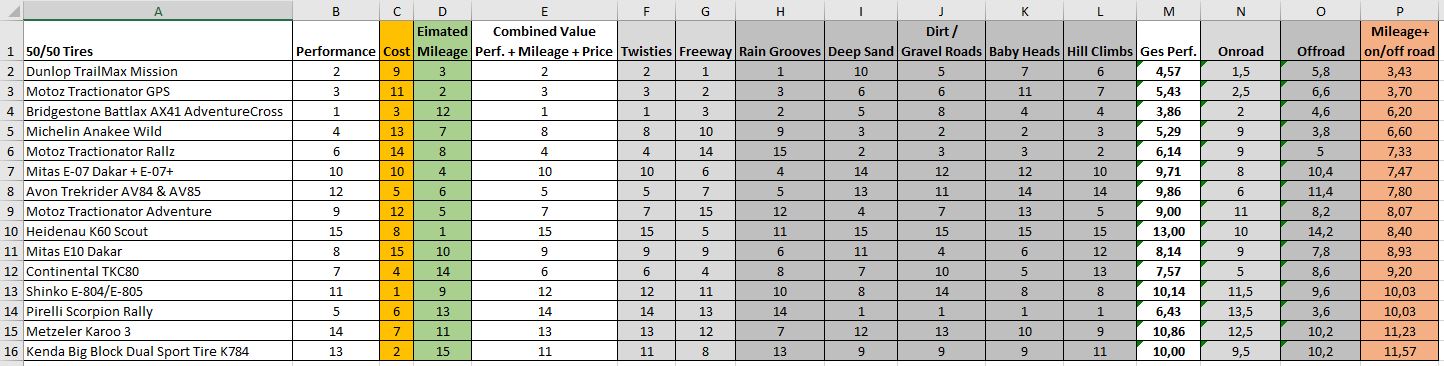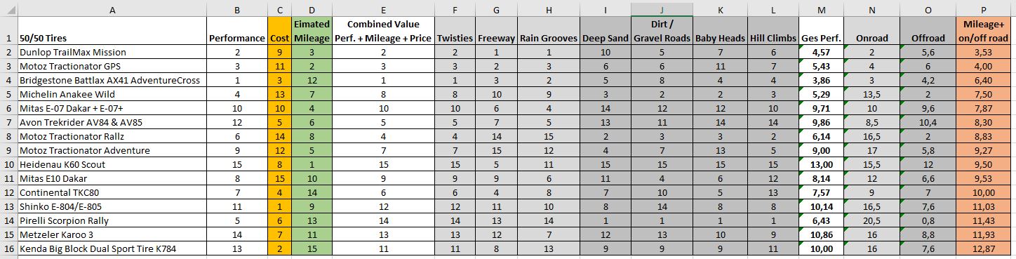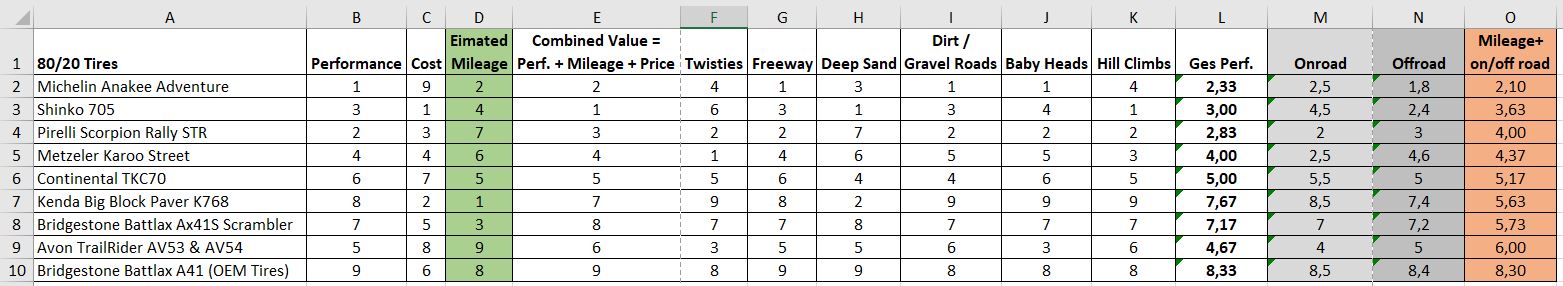 Ich hab den Videovergleich "2020 Adventure Tire Shootout by ChapMoto.com" youtube mal in eine Exceltabelle, damit man besser nach seinen Bedürfnissen sortieren kann.