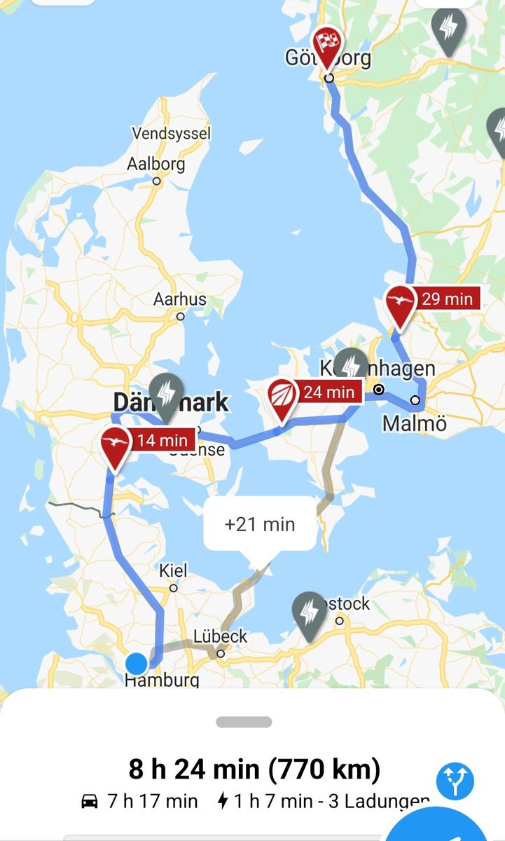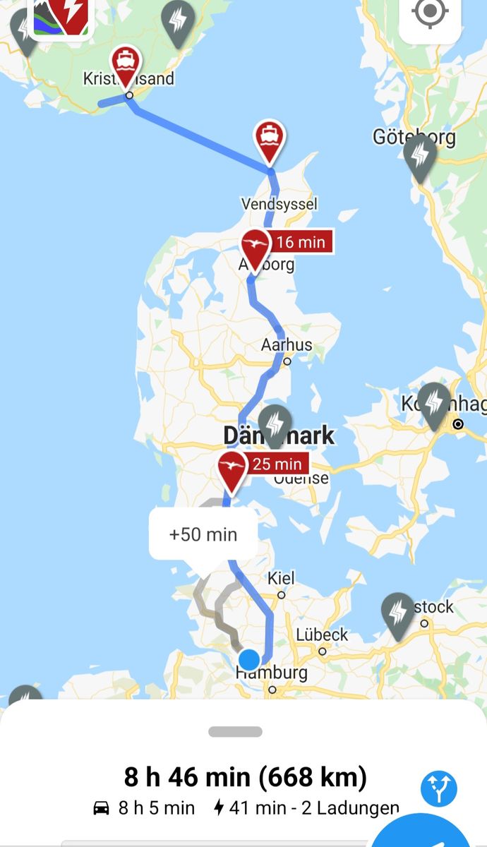 Wenn ich im Routenplaner gucke, ist Norwegen ziemlich gut aufgestellt mit Ladesäulen. Und ich habe nur nach Ladesäulen ab 50KW gesucht.